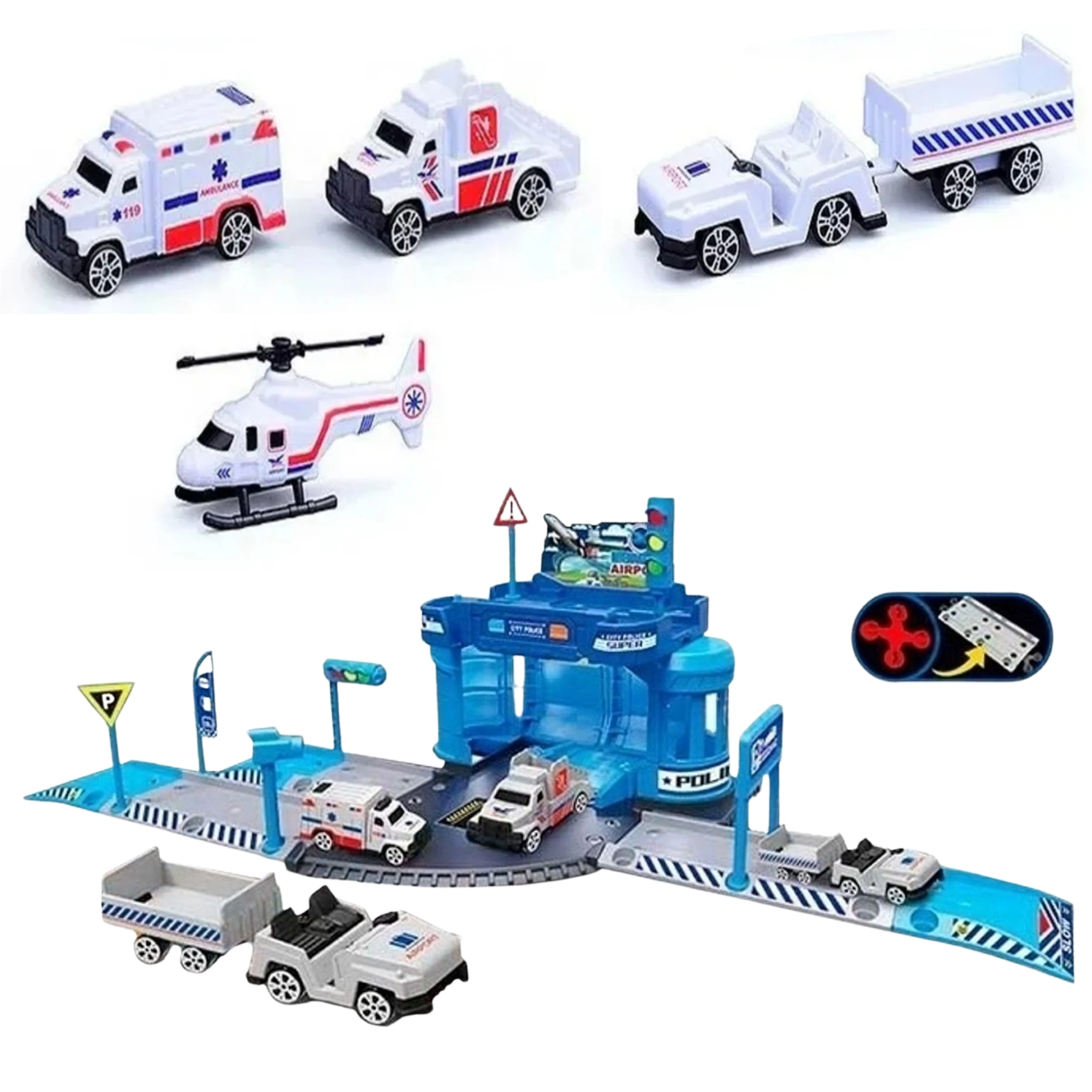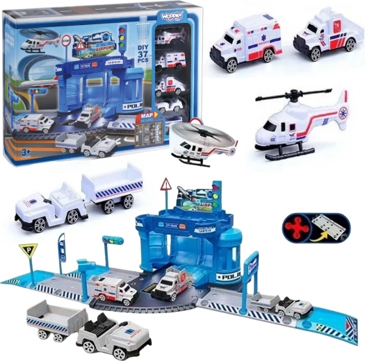 Das Set enthält eine zusammenbaubare Stationsgebäude, ein Polizeiauto, einen kleinen Polizeihubschrauber, ein Flughafen-Treppenfahrzeug, ein Fahrzeug mit Gepäckanhänger, Verkehrszeichen, Elemente der Zufahrtsstraße und eine Folien-Spielmatte 78 × 58 cm. Kinder entwickeln Feinmotorik, Hand-Auge-Koordination und Fantasie.