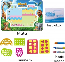 Im Set ist alles enthalten: Wasser-Malunterlage, 3 wiederverwendbare Wasserstifte, 4 Schablonen, 2 Stempel und ein bebildertes Heft mit Anleitungen. Perfekt als Geschenk für kleine Künstler und Vorschulkinder.