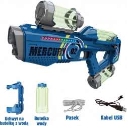 Im Lieferumfang sind drei austauschbare Tanks enthalten, die das Spiel verlängern, ohne häufiges Nachfüllen. Ergonomisches Design und futuristische Optik gewährleisten einen bequemen Griff und einen Stil, der sich von gewöhnlichen Wasserpistolen abhebt.