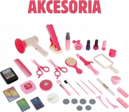 Koffer mit Griff, 2 Haarklammern, 4 Lockenwickler, Puderquaste, Zerstäuber/Mister, 7 Schminkpinsel, 2 Nagellacke, „Mascara“, „Parfüm“, Lidschatten, „Puder“, Lockenstab, Haarglätter, Ablage für den Glätter, Kamm, Bürste, Spiegel, Fön mit austauschbaren Aufsätzen (Diffusor und Flachdüse), Zahlungsterminal, Set Spielgeld, Stammkundenkarte, Zahlungskarte, Karton‑Kosmetikverpackungen (Shampoo, Spülung, Gel), Kartonschild „Beauty Salon“, 2 Paar Scheren, „Lippenstift“