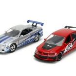 Dieses Premium‑Doppelpack bringt ikonische Filmfahrzeuge in erstklassiger Ausführung: ein roter Lancer Evo IX mit Renn‑Grafiken und markantem Flügel sowie ein silberner Skyline GT‑R R34 mit blauen Streifen. Metallkarosserie, realistische Details und funktionsfähige Türen steigern den Sammel‑ und Spielwert.