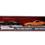 Genießen Sie die authentische Atmosphäre der Filmreihe mit einem detailreich ausgearbeiteten Set aus zwei Metallmodellen. Der Toyota Supra im ikonischen Orange und der schwarze Dodge Charger mit Supercharger überzeugen mit präzisem Exterieur, hochwertigen Drucken und realistisch wirkenden Rädern.