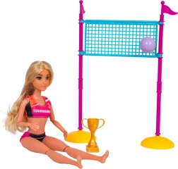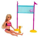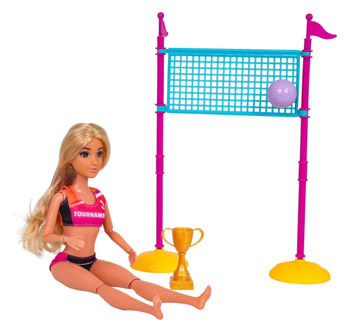 Strandvolleyballnetz, Ball, Pokal und drei Sport-Outfits. Zubehör wie Helm, Schuhe, Brille und Trinkflasche sorgt für Authentizität und Sicherheit beim Spiel.