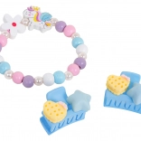 Dieses bezaubernde Set für Kinder kombiniert ein verspieltes Einhornmotiv mit zarten Farben und angenehmen Materialien. Das Armband besteht aus mehrfarbigen Holzperlen und kleinen Perlen, ergänzt durch einen niedlichen Einhornanhänger. Zwei praktische Spangen vervollständigen jede Frisur und regen die Fantasie beim Spielen an.