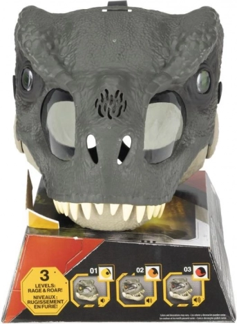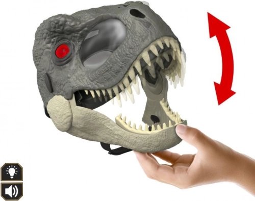 Werde zum König der Urzeit! Die Deluxe T-Rex-Maske bietet ein beeindruckendes Erlebnis mit LED-Lichteffekten in den Augen, die sich beim Öffnen des Mauls verändern, sowie kräftigen Sounds – von tiefem Knurren bis zum ikonischen Brüllen des T-Rex bei schnellem Aufreißen der Kiefer.