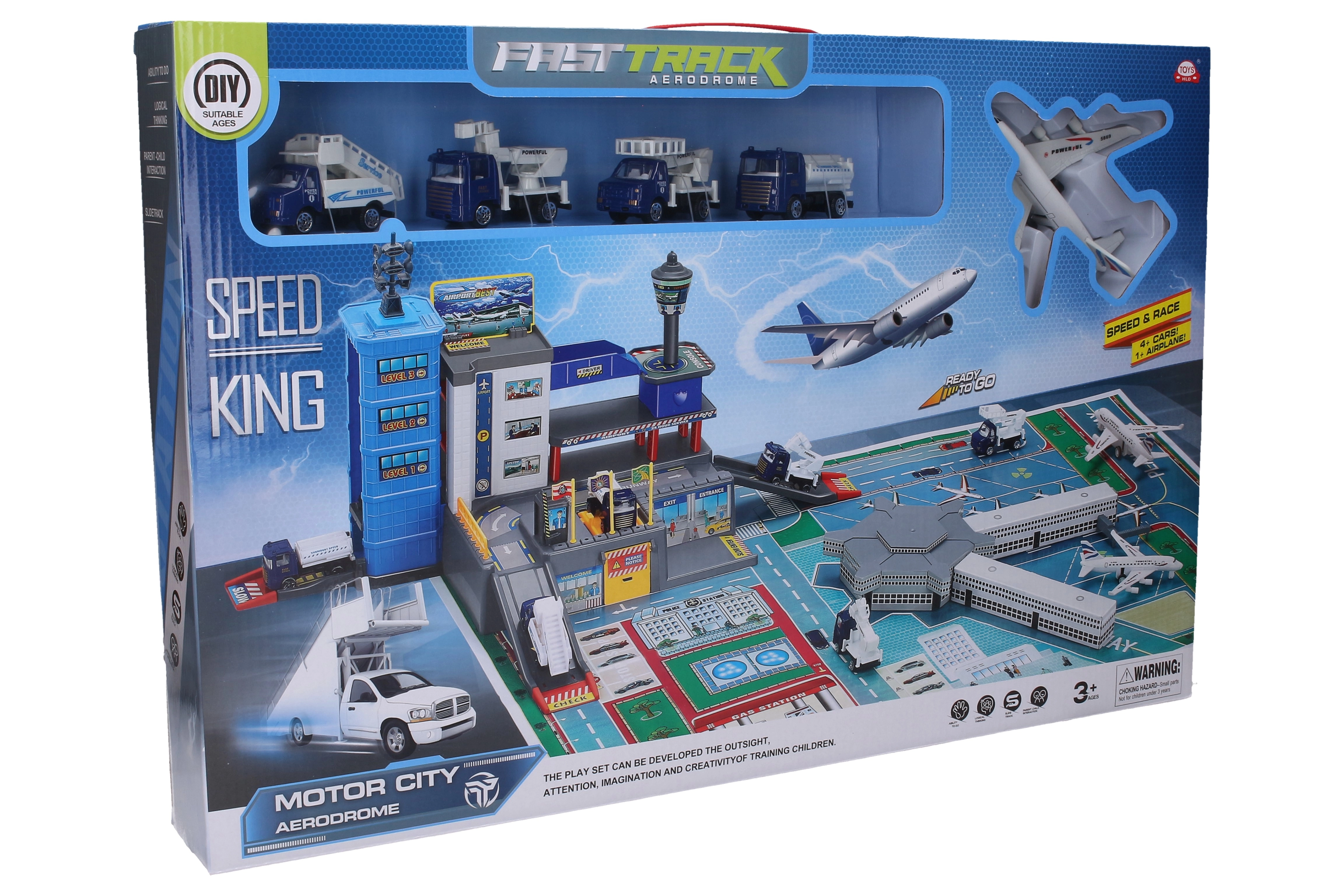 • Komplett-Set – Flughafengarage/Spielplatte, 4 Metallautos, 1 Metallflugzeug