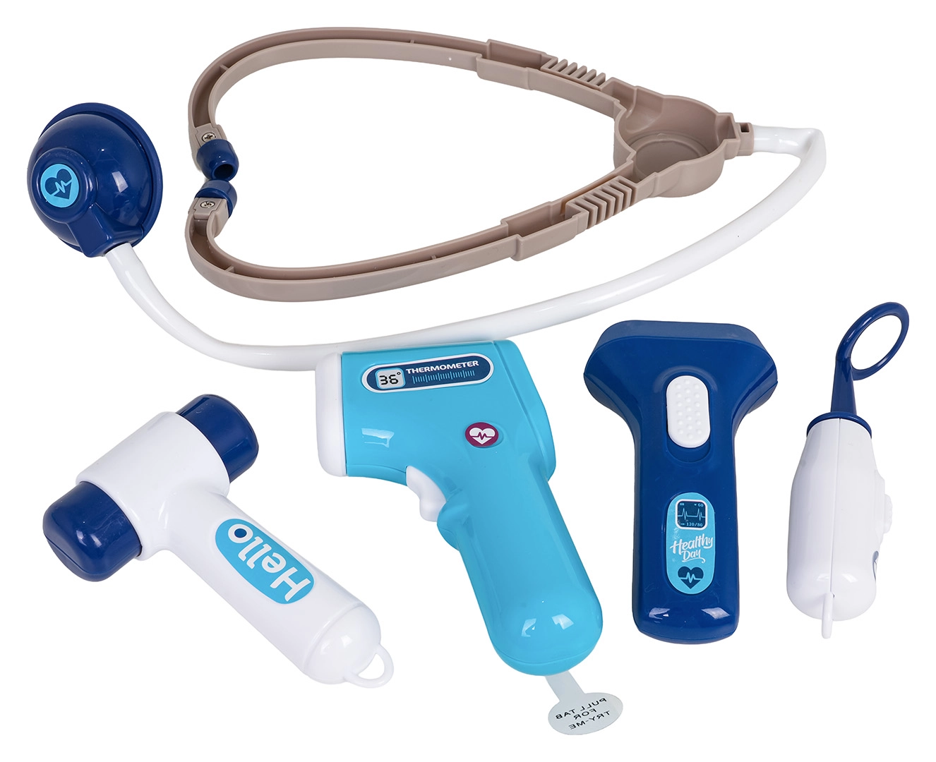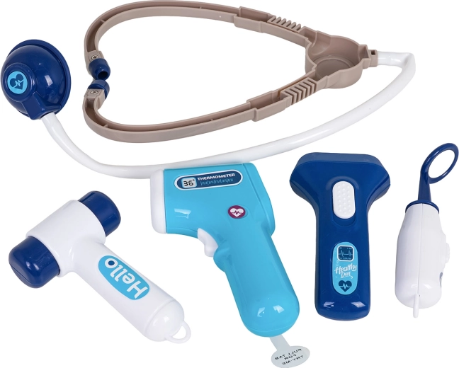 Stethoskop, kontaktloses Thermometer mit Licht, Spritze, Schere, Pinzette, Spiegel, Hammer, Brille, Patientenkarte und weiteres Zubehör für kreatives Spielen.