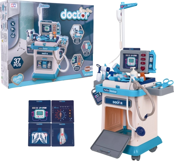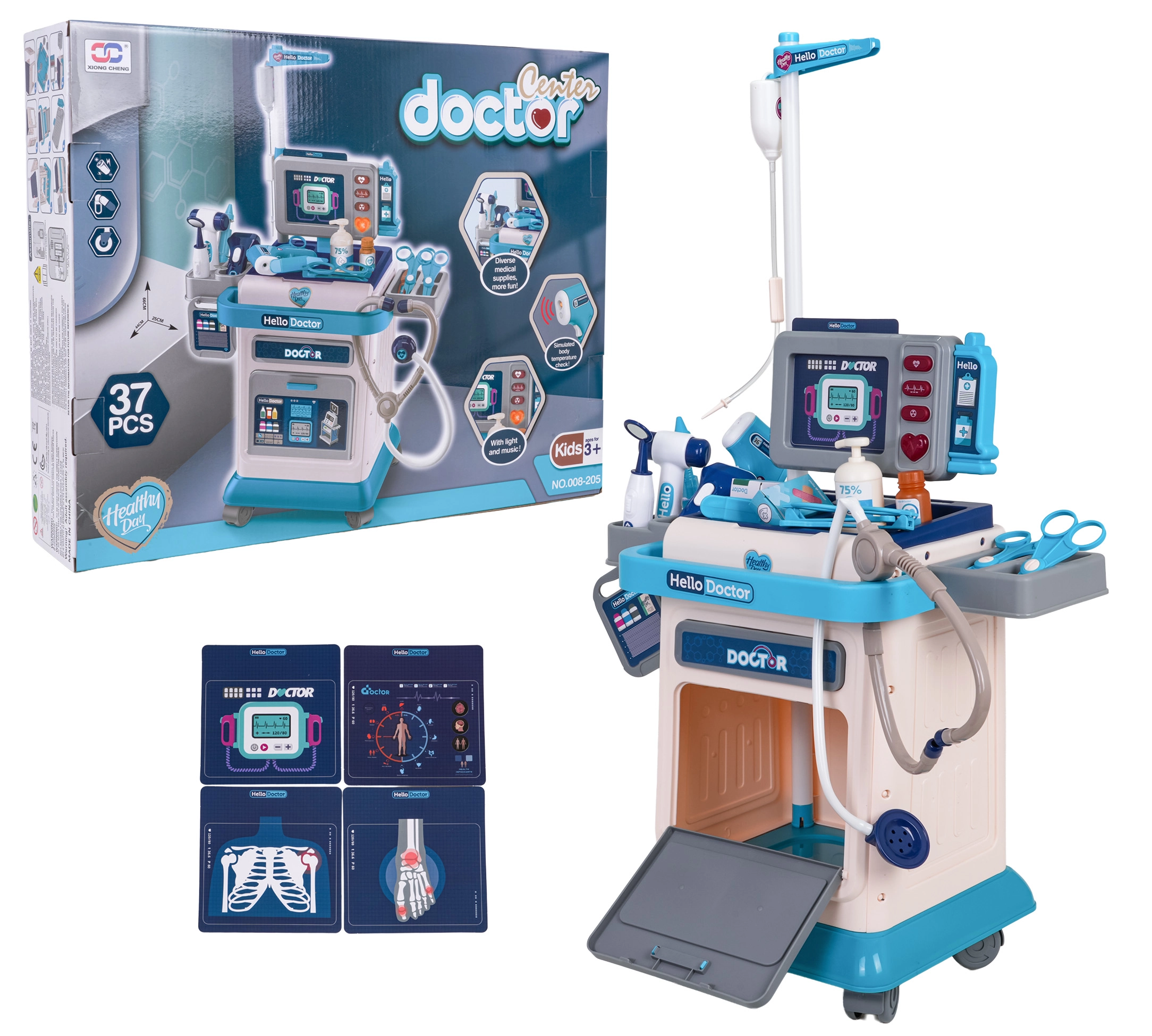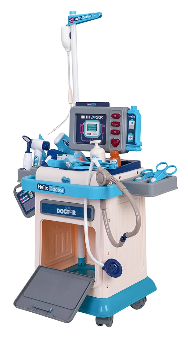 In dem Set finden Kinder alles Nötige: Stethoskop, kontaktloses Thermometer mit Licht, Spritze, Schere, Pinzette, Spiegel, neurologischer Hammer, Brille sowie kleine Extras wie Patientenkarte, Fläschchen mit „Desinfektion“, Schachtel mit Pflastern und Medikamenten sowie ein IV-Ständer. Der Wagen verfügt über eine praktische Schublade und Halterungen für eine übersichtliche Aufbewahrung der Instrumente.