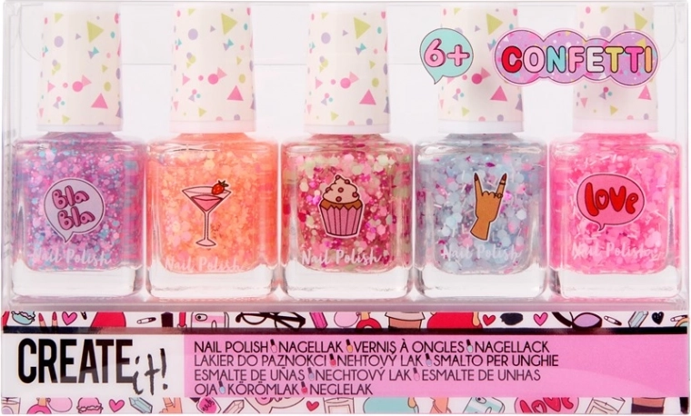 Das Kinder-Nagellackset mit Konfetti macht jedes Nagelstyling zu einem fröhlichen Ritual. Fünf farbige Lacke à 8 ml sind mit feinem Glitzer und Konfetti angereichert und erzeugen einen fröhlichen, mehrschichtigen Effekt. Die Formel ist sanft und speziell für die Anwendung bei Kindern geeignet.