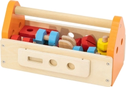 Die praktische tragbare Kiste hält alle Teile beisammen. Kinder können ganz einfach stecken, schrauben und hämmern – zu Hause und unterwegs.