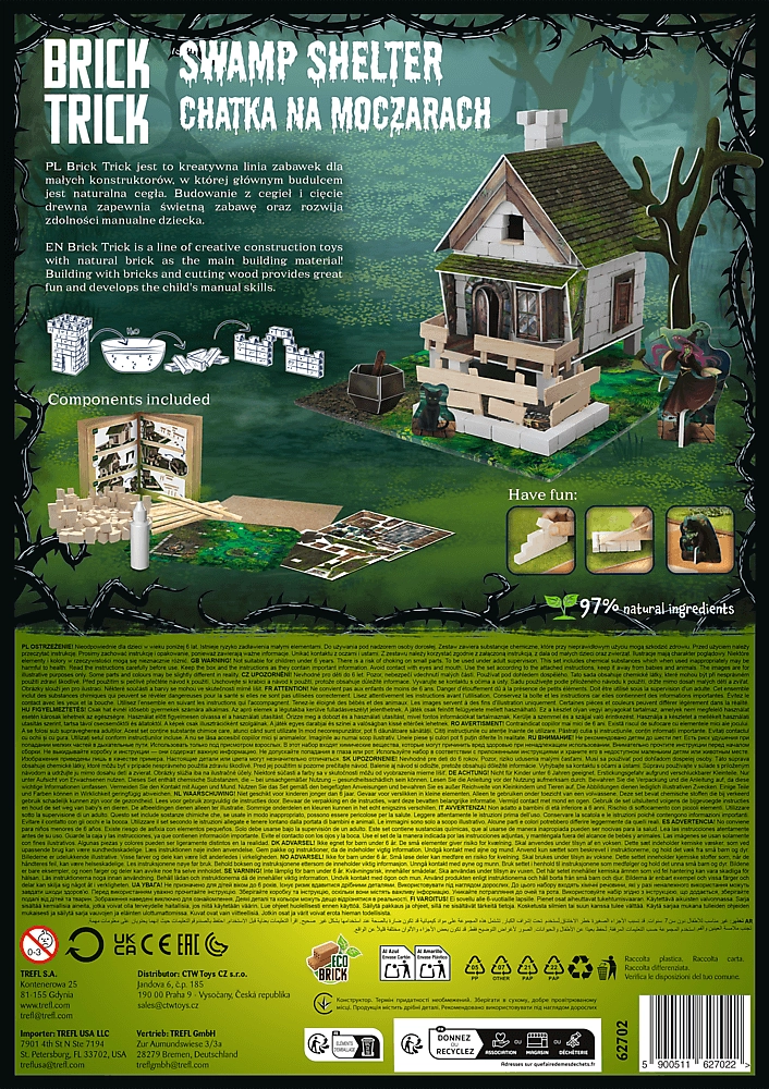 Die BRICK TRICK Bausets von TREFL können mehrfach verwendet werden – den Kleber einfach in Wasser auflösen, die Teile reinigen und erneut bauen. Durch die Kombination mehrerer Sets erschaffen Sie ein malerisches Dorf, eine moderne Stadt oder eine mittelalterliche Siedlung.