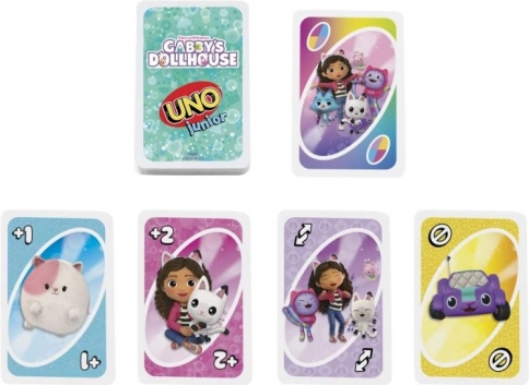 - UNO Junior Kartenset mit Gabby’s Dollhouse Motiv (Farben und Kartendesign können variieren)