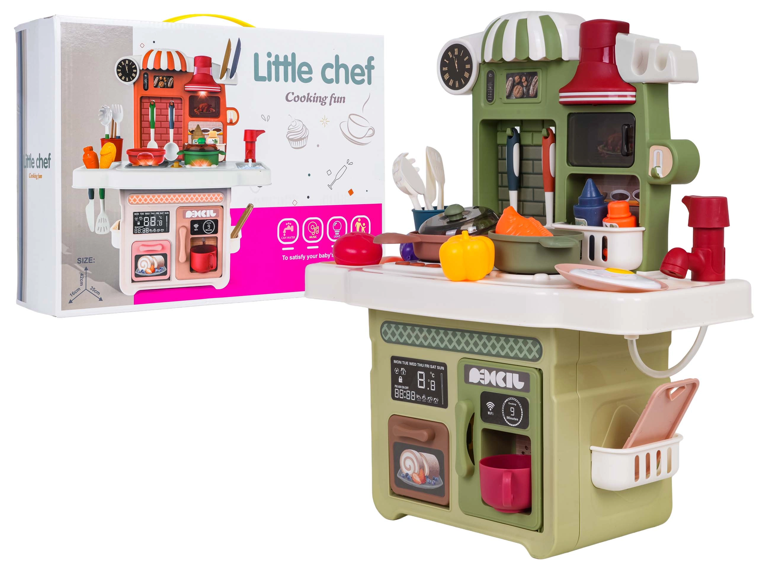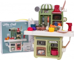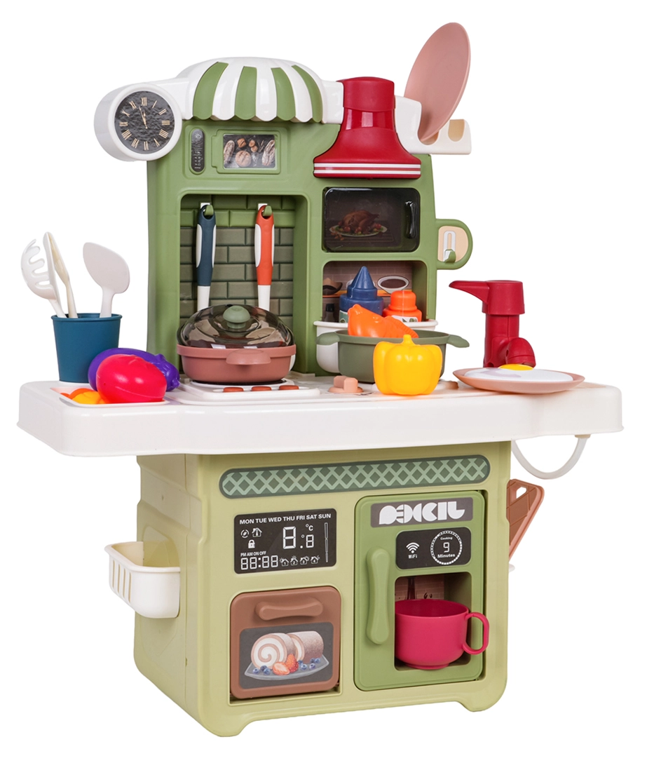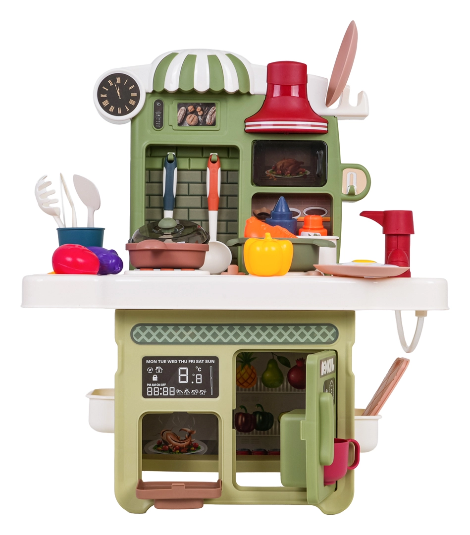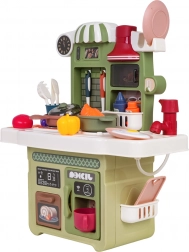 Zum Lieferumfang gehört ein funktionierender Pump-Wasserhahn mit Umlaufwasser, sodass Kinder Geschirr „abwaschen“ können wie in einer echten Küche. Ebenfalls dabei: eine Kaffeemaschinen-Attrappe, eine beleuchtete Dunstabzugshaube und ein zu öffnender Backofen. Zahlreiches Zubehör – Töpfe, Pfannen, Teller, Utensilien und Lebensmittel – erweitert die Spielmöglichkeiten.