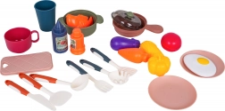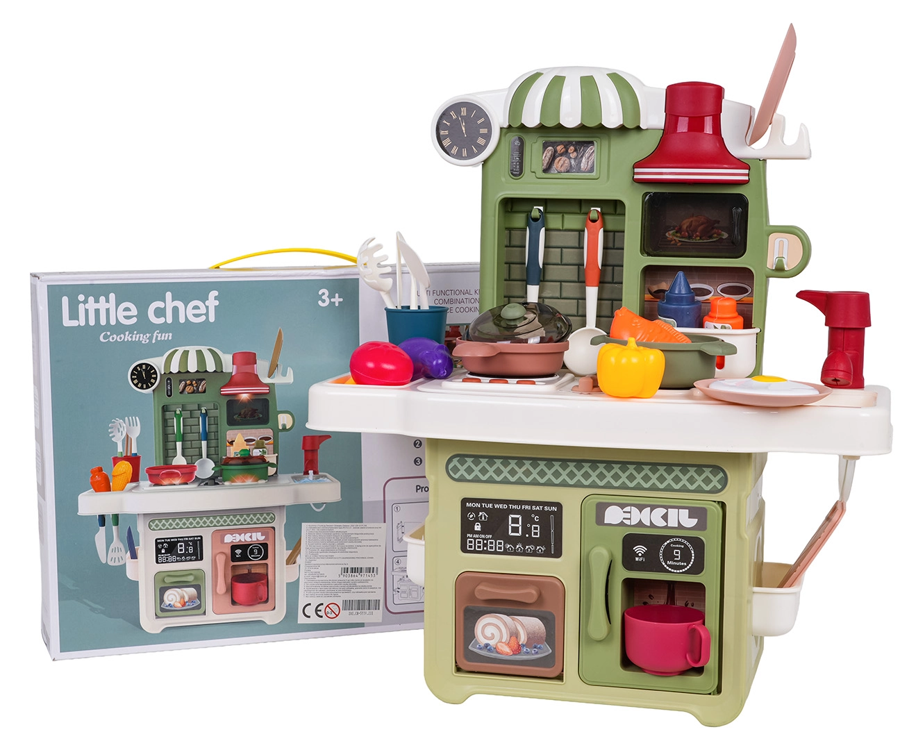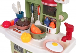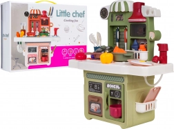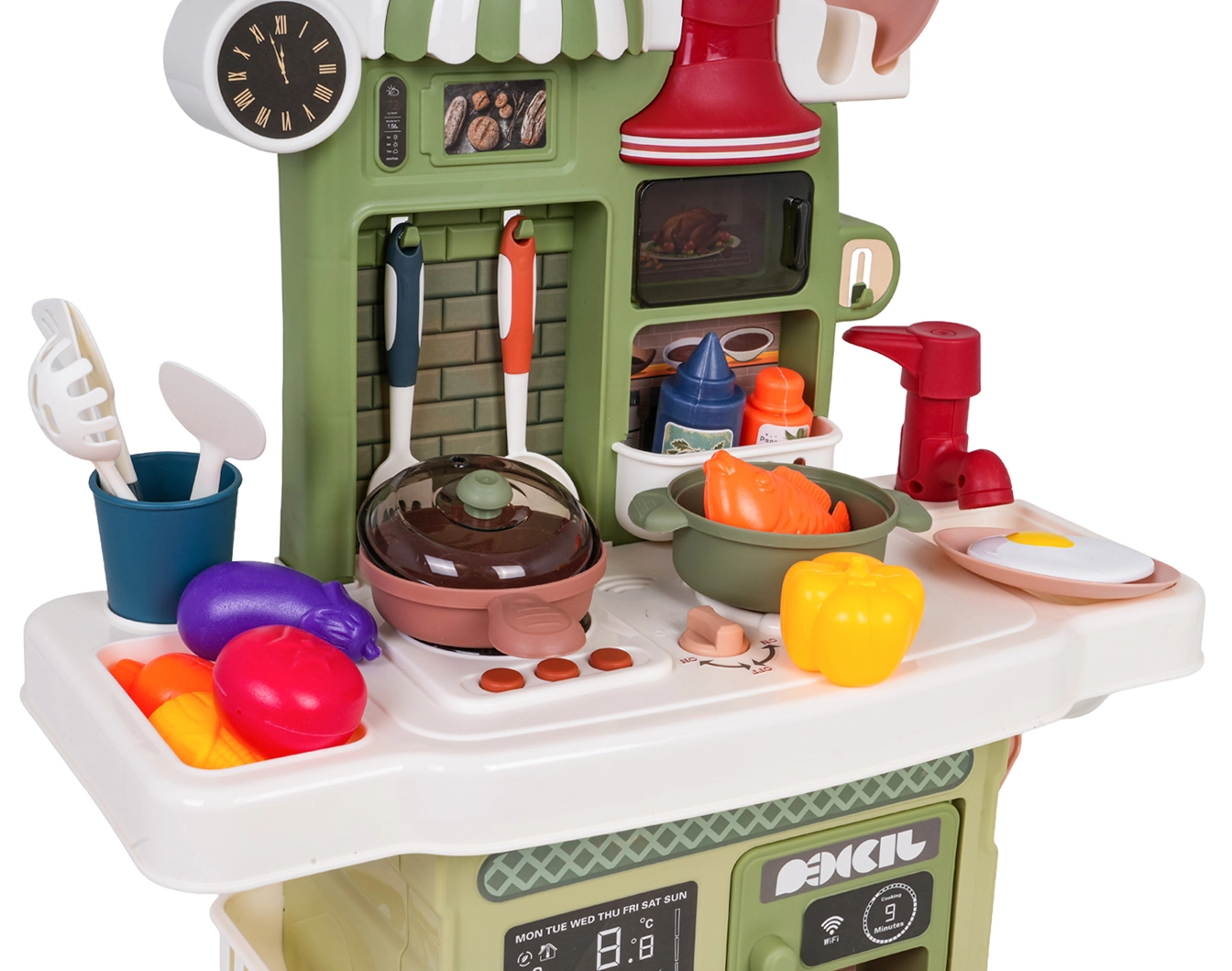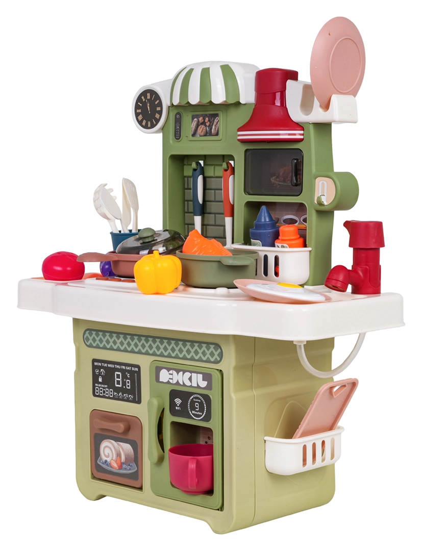 Zum Lieferumfang gehört ein funktionierender Pump-Wasserhahn mit Umlaufwasser, sodass Kinder Geschirr „abwaschen“ können wie in einer echten Küche. Ebenfalls dabei: eine Kaffeemaschinen-Attrappe, eine beleuchtete Dunstabzugshaube und ein zu öffnender Backofen. Zahlreiches Zubehör – Töpfe, Pfannen, Teller, Utensilien und Lebensmittel – erweitert die Spielmöglichkeiten.