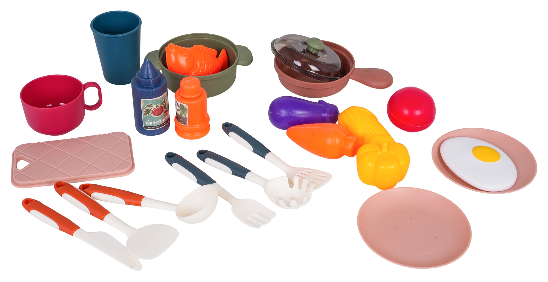 Pfanne, Topf mit Deckel, Teller, Besteck, Küchenutensilien und Spiellebensmittel – alles findet seinen Platz in Regalen, an Haken und im Ofen.