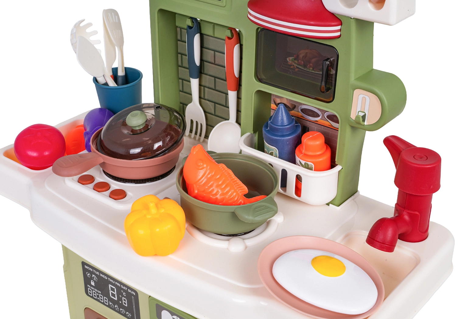 Der Pump-Wasserhahn lässt echtes Wasser laufen, sodass kleine Köche Geschirr abspülen und spielerisch Hygieneroutinen üben können.