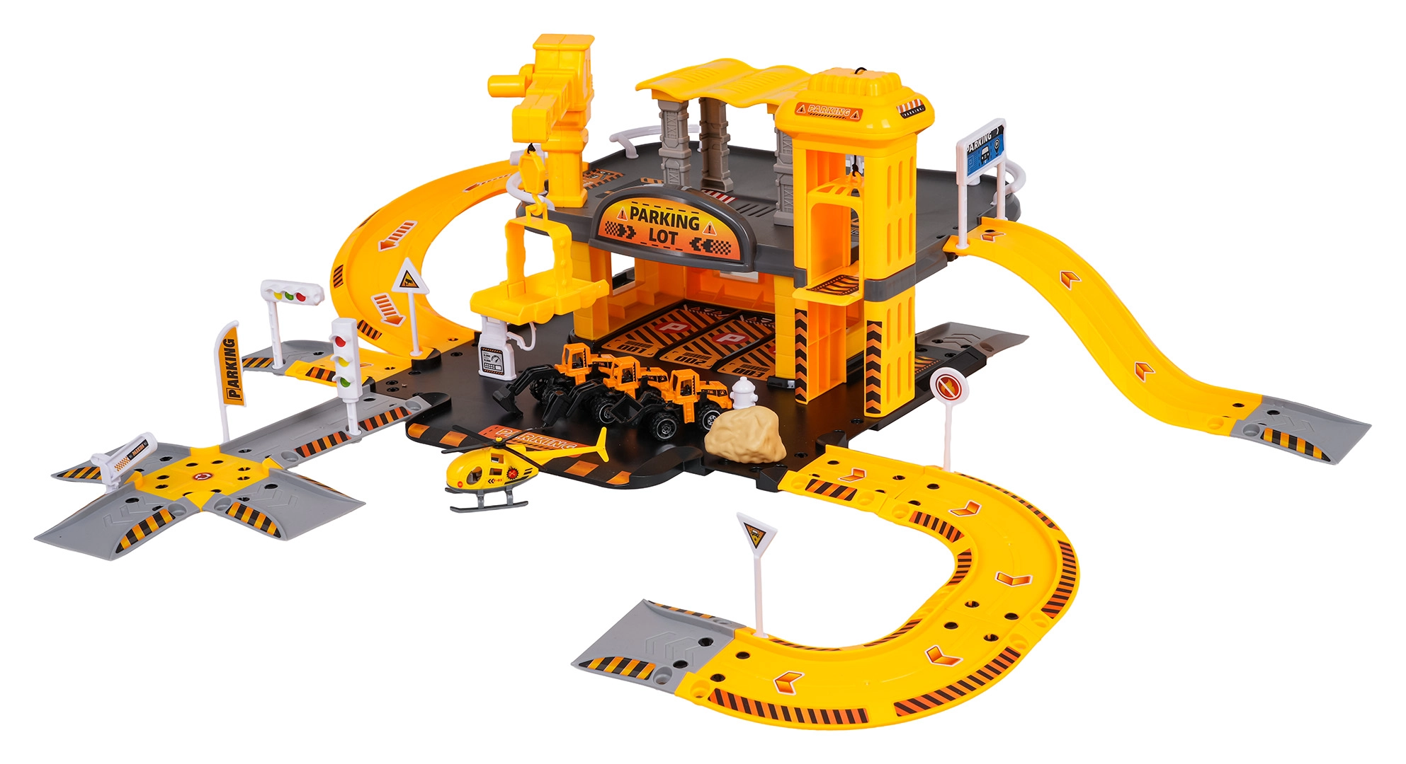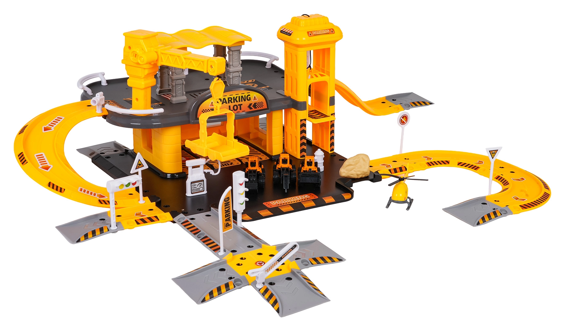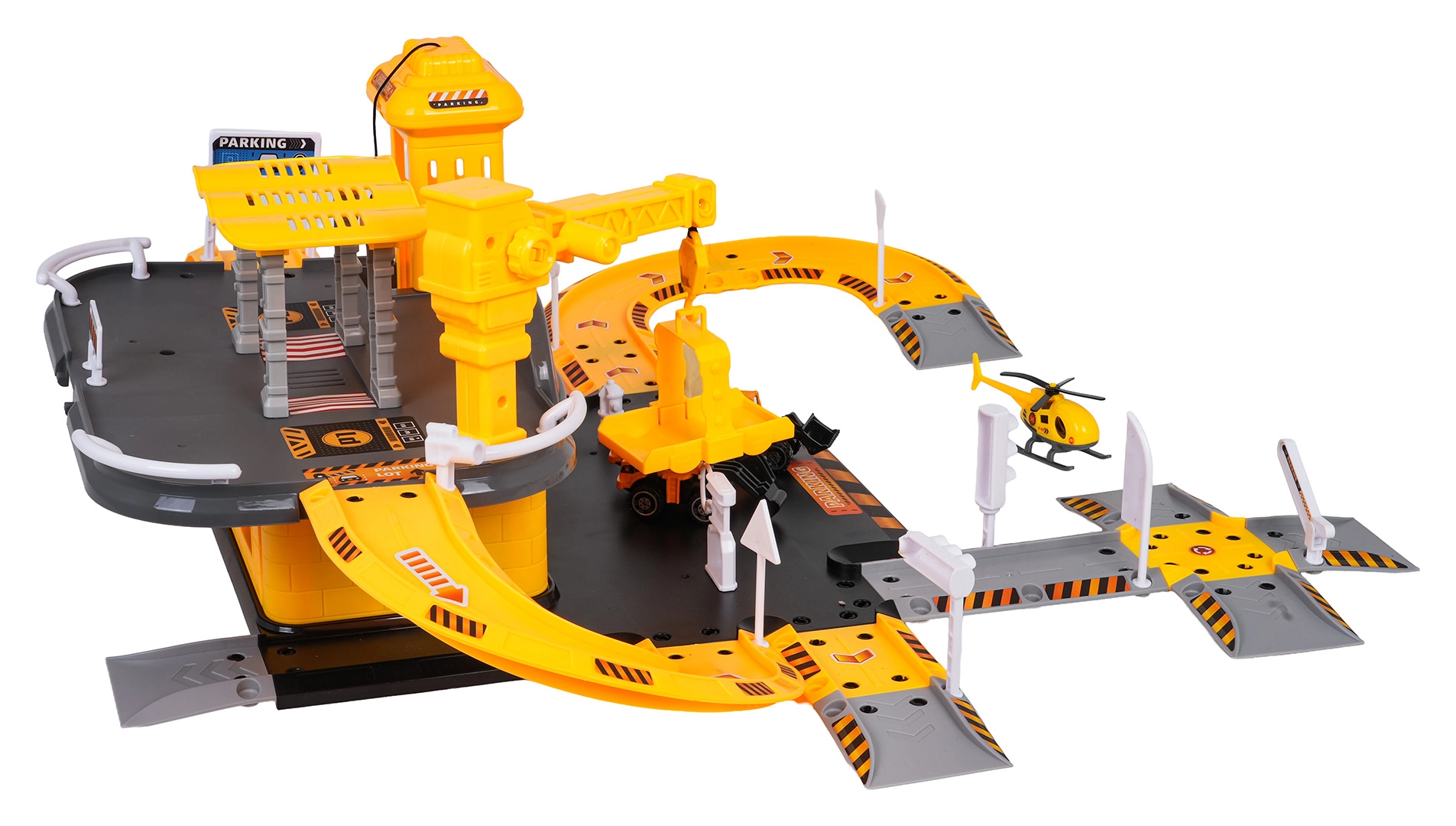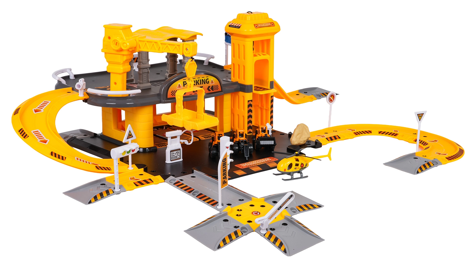 Dieses detailreich gestaltete Bauparkhaus begeistert kleine Fans von Baumaschinen. Im unteren Geschoss gibt es eine Tankstelle und Straßen; der manuelle Aufzug bringt die Fahrzeuge ins erste Obergeschoss, wo sich der Baustellenbereich mit funktionalem Kran befindet. Die kompakte Anlage bietet viele Spielmöglichkeiten und flüssige Fahrten über die gewundenen Rampen.