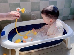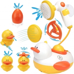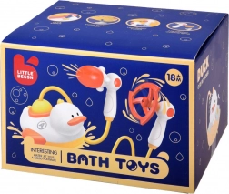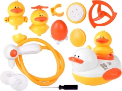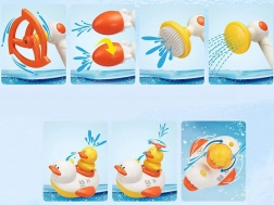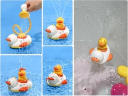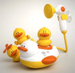 Die schwimmende Ente funktioniert wie eine Wasserpumpe – auf die Wasseroberfläche gelegt und per Knopfdruck beginnt sie, Wasser zu fördern und schafft zusammen mit den austauschbaren Zubehörteilen Fontänen, Sprühnebel und drehende Effekte. Kinder können eine von drei kleinen Entchen mit unterschiedlichen Wasserspielen wählen oder die Handdusche mit Aufsätzen für sanftes Abspülen verwenden.