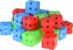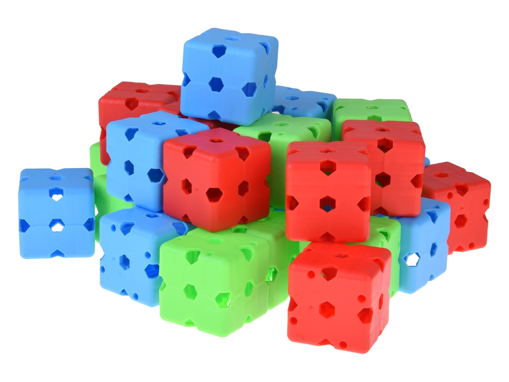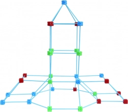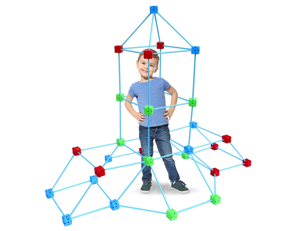 Bunte Würfel mit mehrdirektionalen Öffnungen ermöglichen das Verbinden der Stäbe in verschiedenen Winkeln. So entstehen im Nu Türme, Kuppeln und großzügige Spiel-Forts.