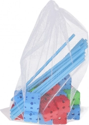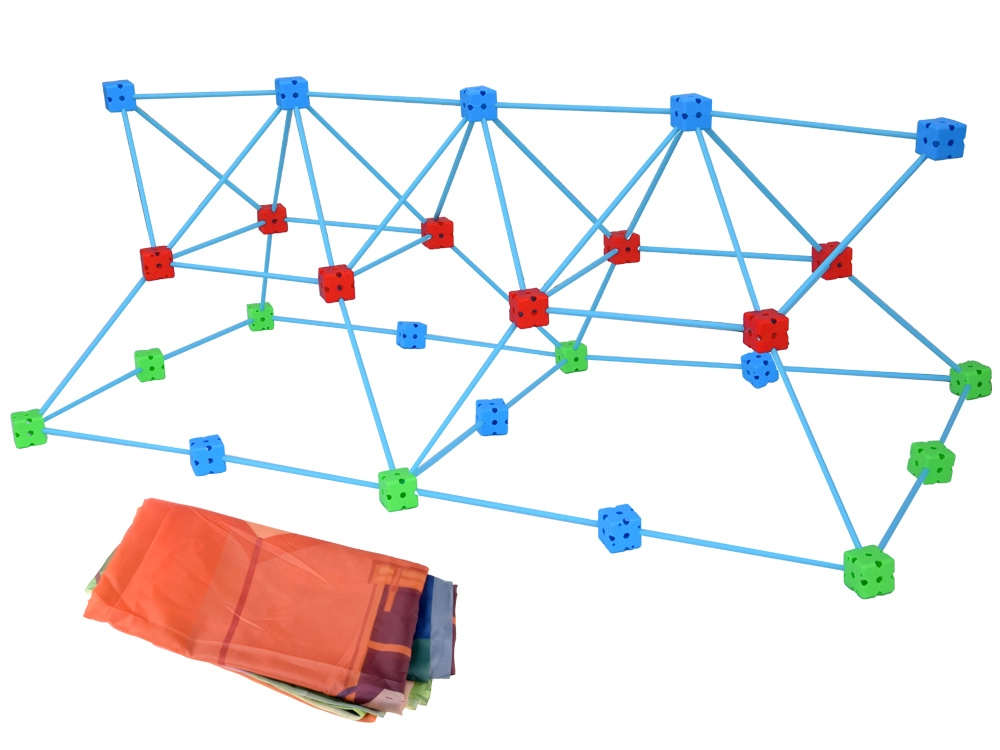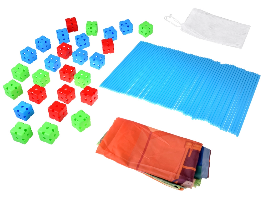 Dieses kreative Bauset bietet 89 Teile für große Ideen: 58 robuste Stäbe/Strohhalme (ca. 38 cm) und 29 Verbindungswürfel (ca. 5 × 5 × 5 cm) ergänzt durch eine große Textilplane mit Aufdruck „Camping“ und einen praktischen Netz-Aufbewahrungsbeutel. Dank der leichten Stäbe und modularen Verbinder entstehen stabile, dennoch leicht versetzbare Konstruktionen.