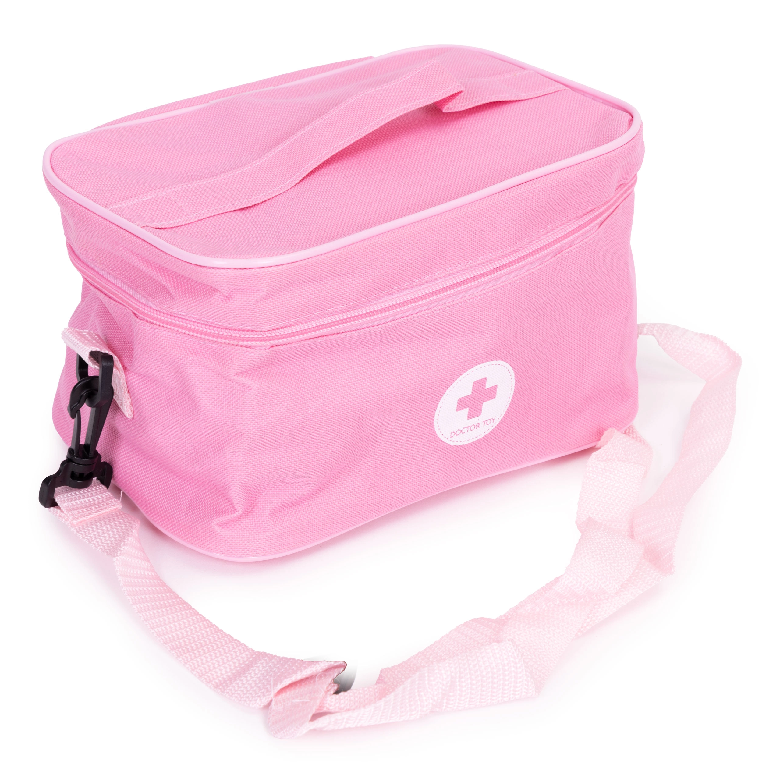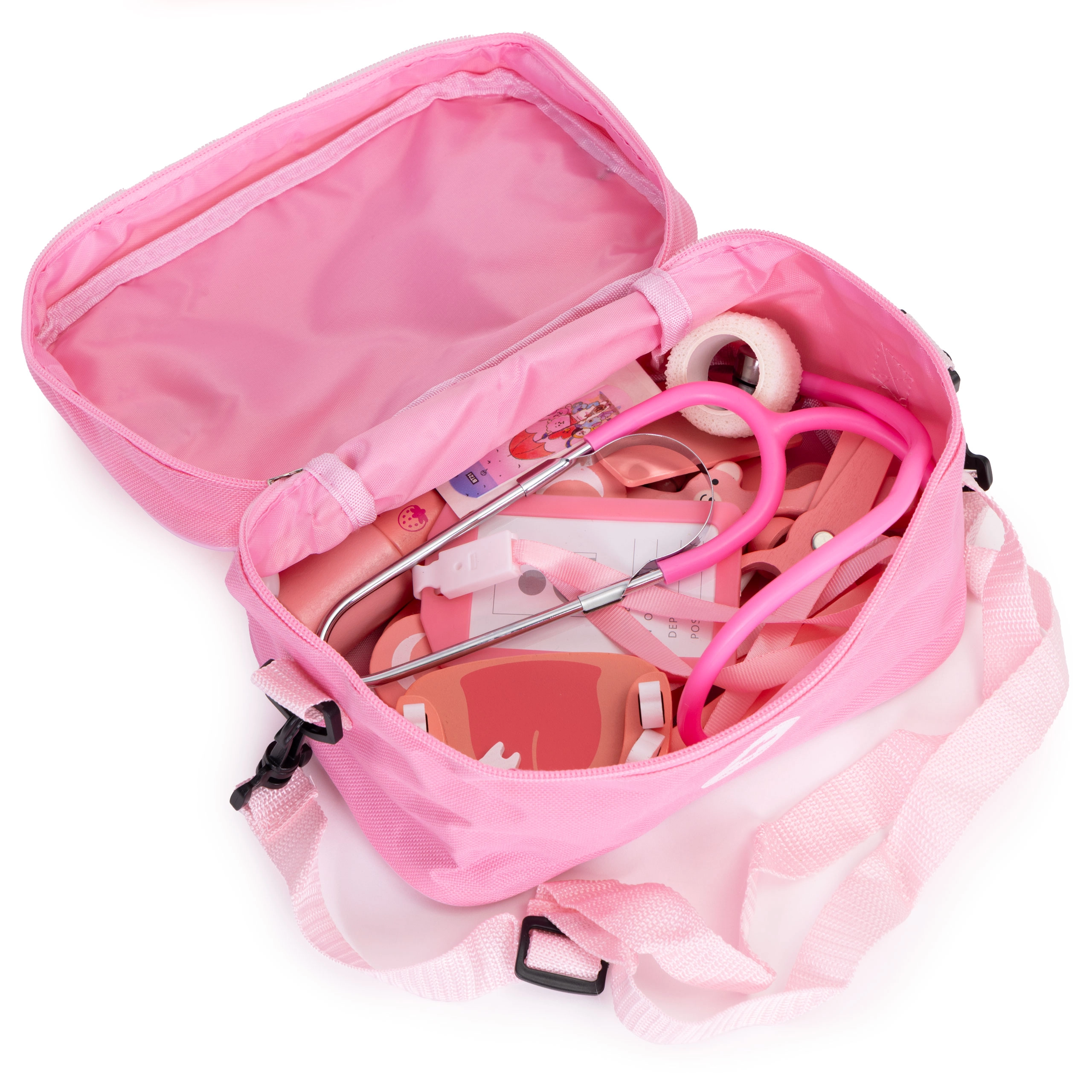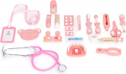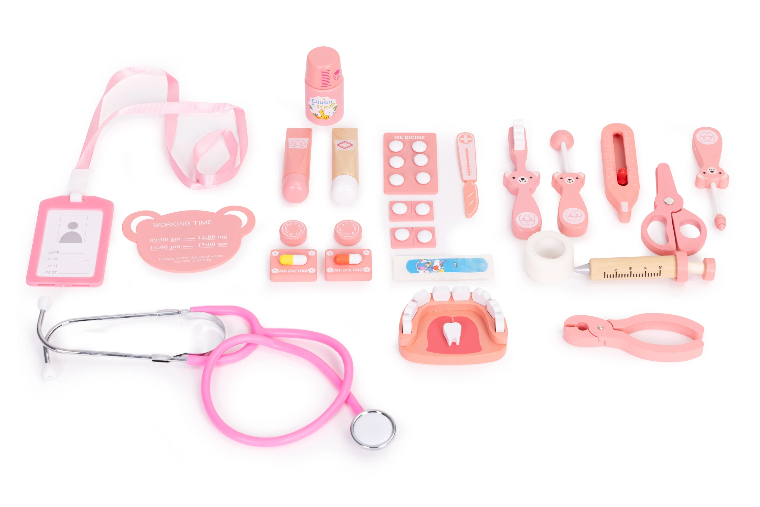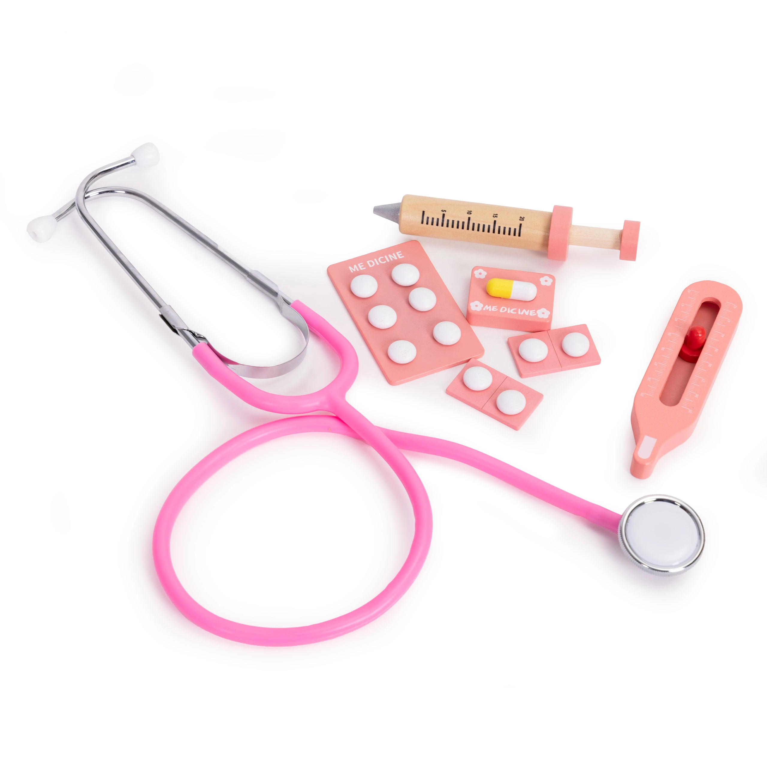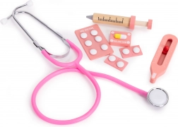 Stethoskop, Thermometer, Spritze und „Medikamente“ in Blistern regen die Fantasie an und fördern die Feinmotorik beim spielerischen Untersuchen der Patienten.