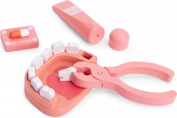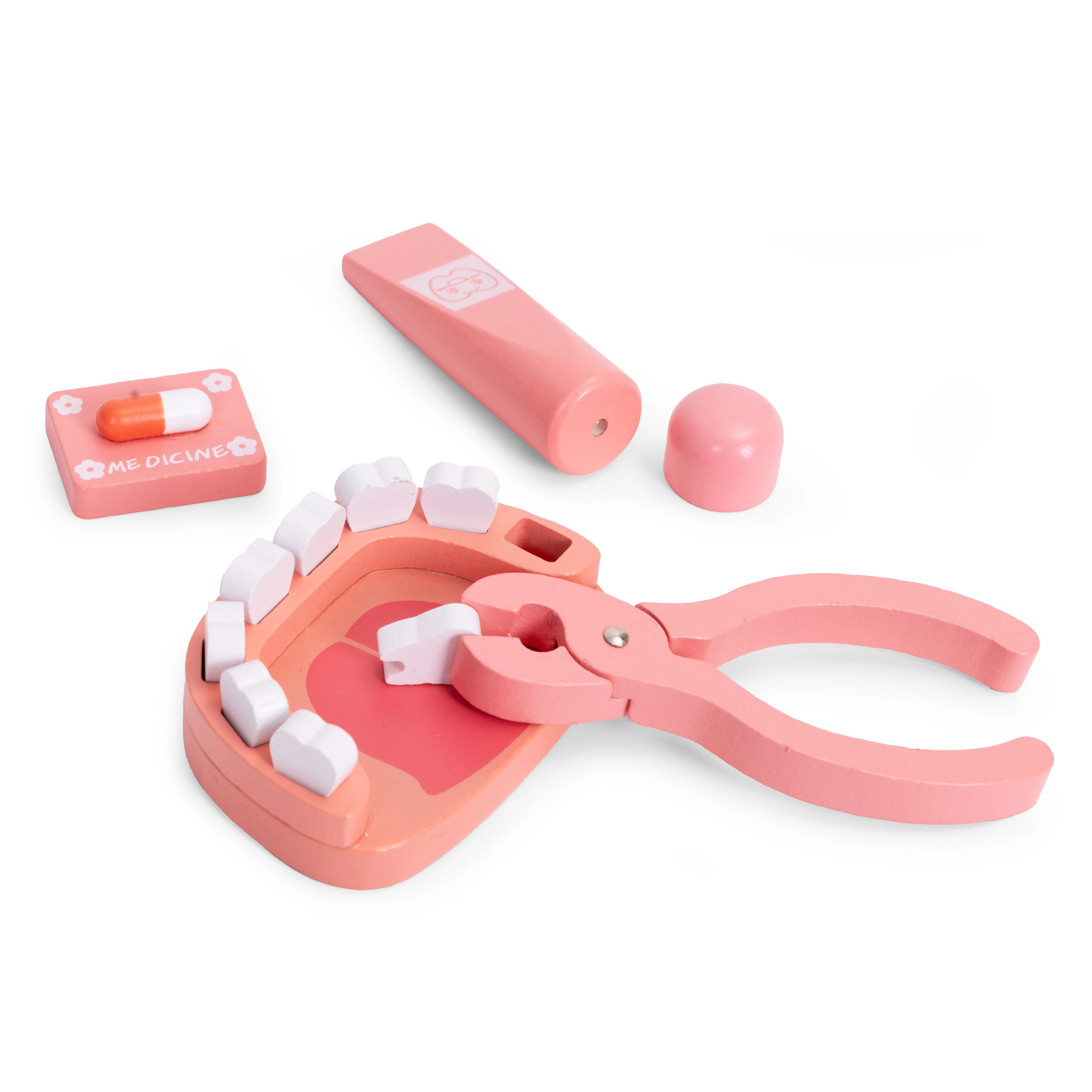 Das rosafarbene hölzerne Zahnset mit Kiefer und herausnehmbaren Zähnen vermittelt Kindern richtige Mundhygienegewohnheiten und reduziert die Angst vor dem Zahnarzt.