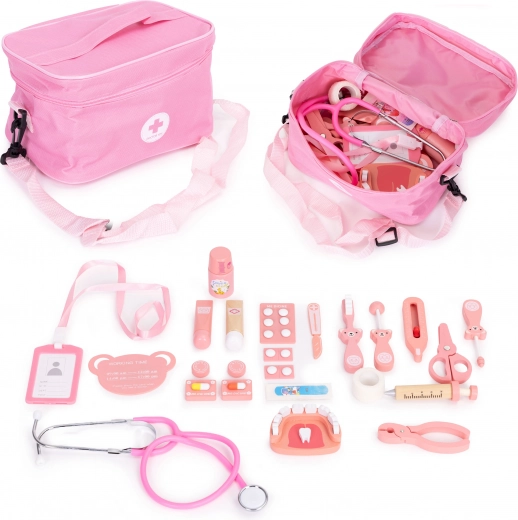 Dieses umfassende hölzerne Arztset ist ideal für Kinder ab 3 Jahren. Dank der umfangreichen Ausstattung – vom Stethoskop über das Thermometer bis zum Zahnmodell mit herausnehmbaren Zähnen – lernen Kinder spielerisch grundlegende medizinische Werkzeuge kennen. Die leichte Stofftasche mit Reißverschluss und Gurt sorgt für bequemes Verstauen und Mitnehmen.
