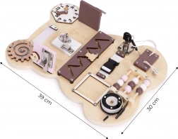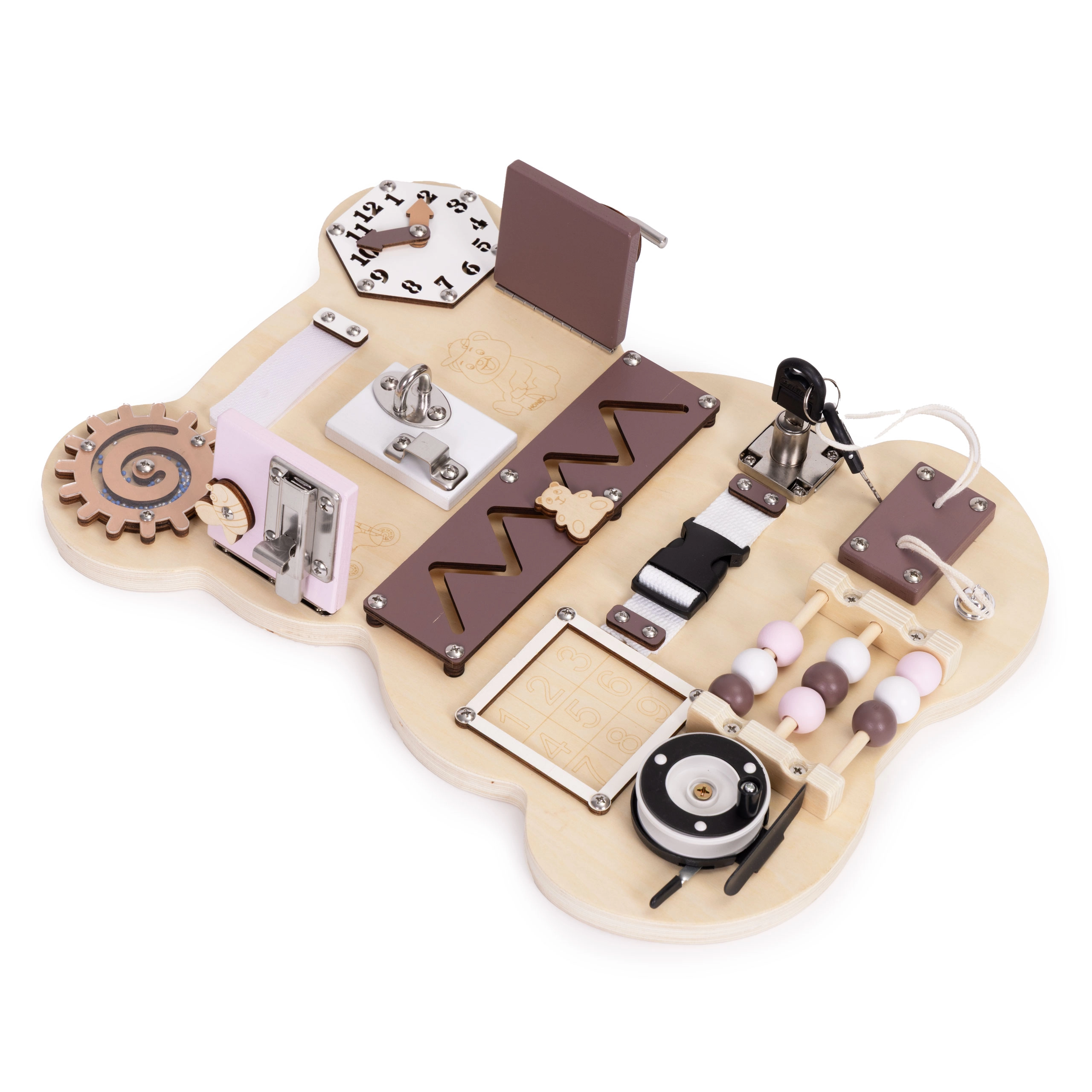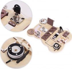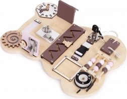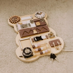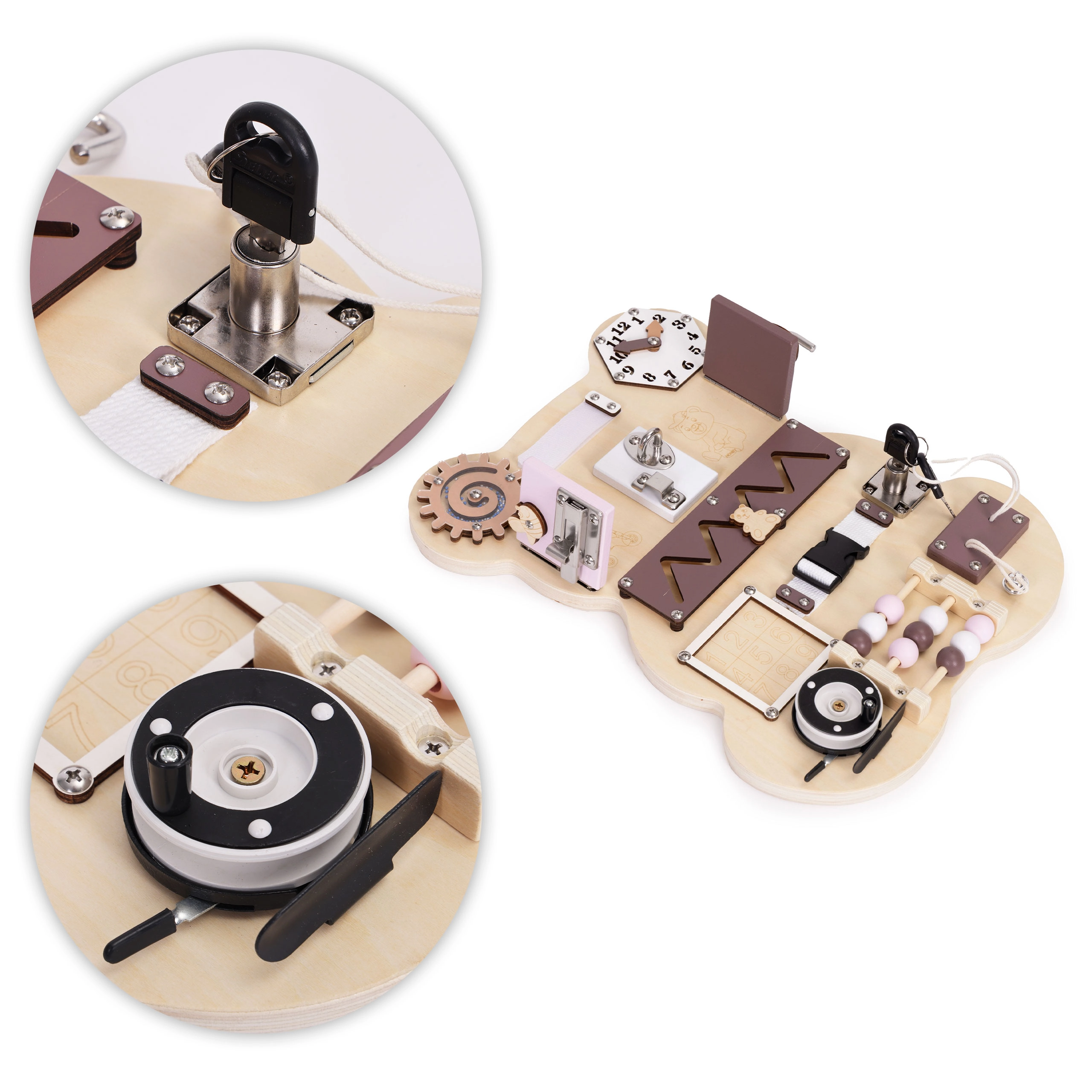 Das aktive Holzbrett ECOTOYS in Bärenform ist ein durchdachtes Lernspielzeug für Kinder ab 3 Jahren. Durch die Kombination aus Holz, Metall und textilem Material trainieren Kinder den Griff, die Augen-Hand-Koordination und Geduld. Die vielfältigen Elemente – vom Schloss mit Schlüssel über Zahnräder bis hin zur beweglichen Uhr – führen spielerisch zum Entdecken und fördern Selbstständigkeit.