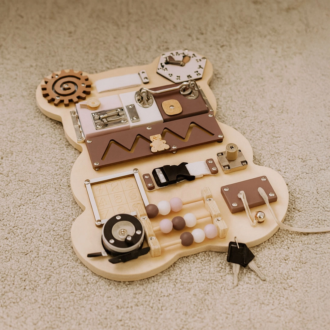 Das Busyboard unterstützt sensorische Reize und sicheres Experimentieren mit Mechanismen aus dem Alltag. Kinder üben spielerisch Zählen am Kugel-Abakus, verstehen Ursache–Wirkung und erwerben praktische Fähigkeiten, die auch außerhalb des Spiels nützlich sind.