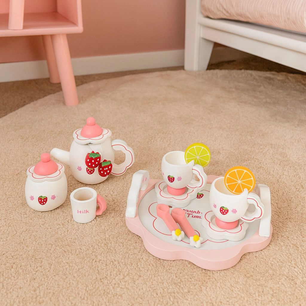 Entdecken Sie den Zauber der Teestunde mit dem Holzset von ECOTOYS, inspiriert vom niedlichen Erdbeermotiv. Das Set imitiert realistisch das echte Servieren – von der Kanne und Zuckerdose bis zu Zitronen- und Orangenscheiben. Alle Teile sind aus hochwertigem Holz, haben abgerundete Kanten und passen perfekt in Kinderhände.