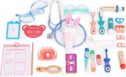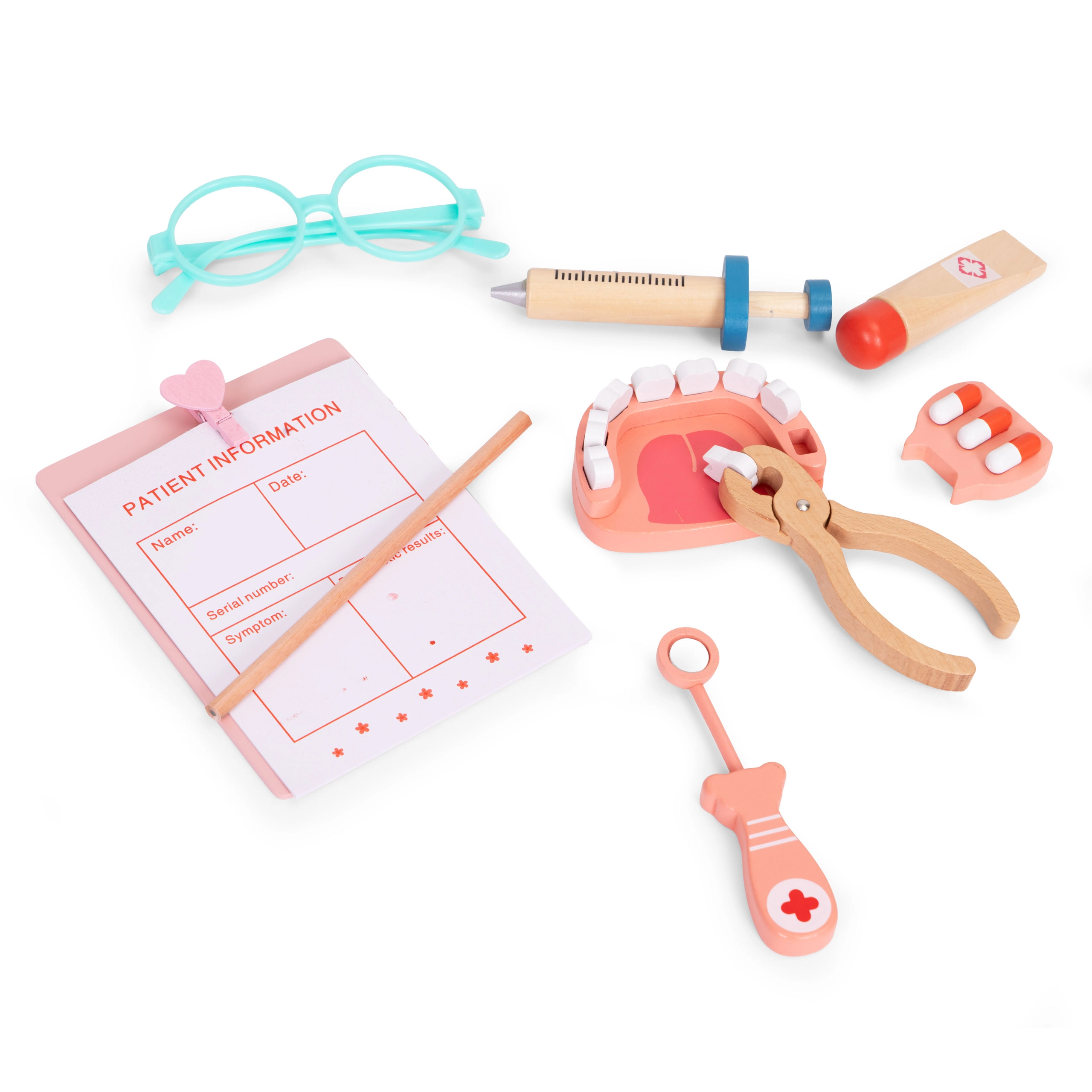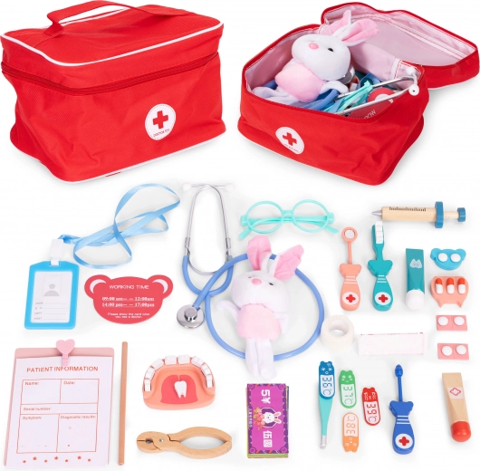 Das Set beinhaltet auch Zahnzubehör – eine Prothese mit herausnehmbaren Zähnchen, ein Zahnspiegel und eine Bürste, perfekt, um die Grundlagen der Mundhygiene zu vermitteln. Alles ist in einer praktischen Textiltasche mit Reißverschluss verstaut, was Transport und Ordnung erleichtert.