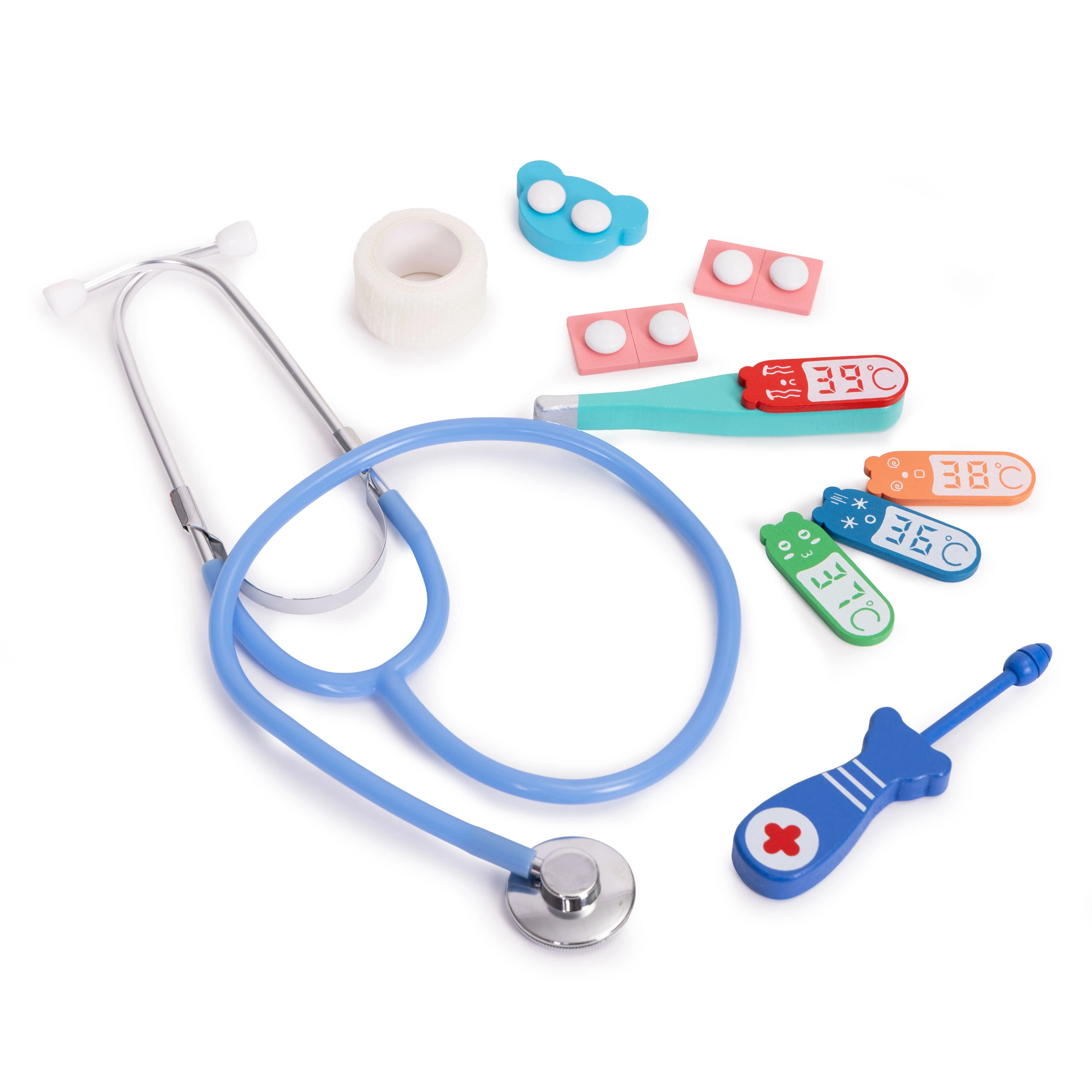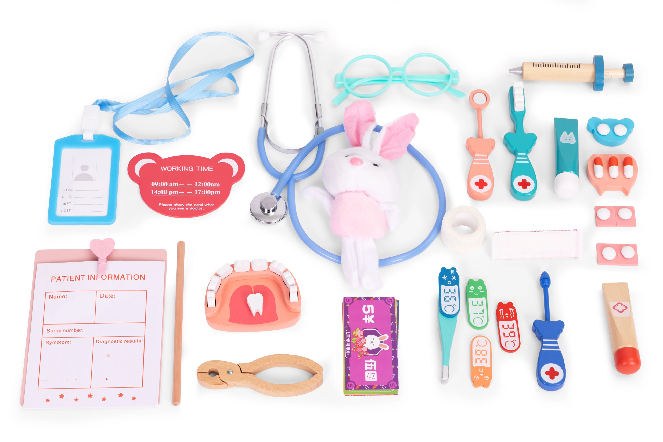 Stethoskop, Thermometer, Spritze und weitere Instrumente ermöglichen Kindern, „Untersuchungen“ durchzuführen und in sicherer Umgebung Fürsorge zu üben.