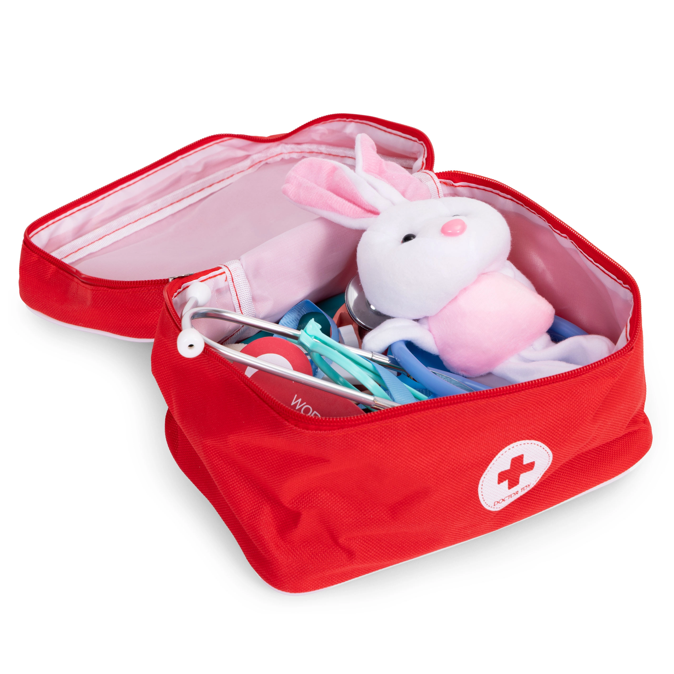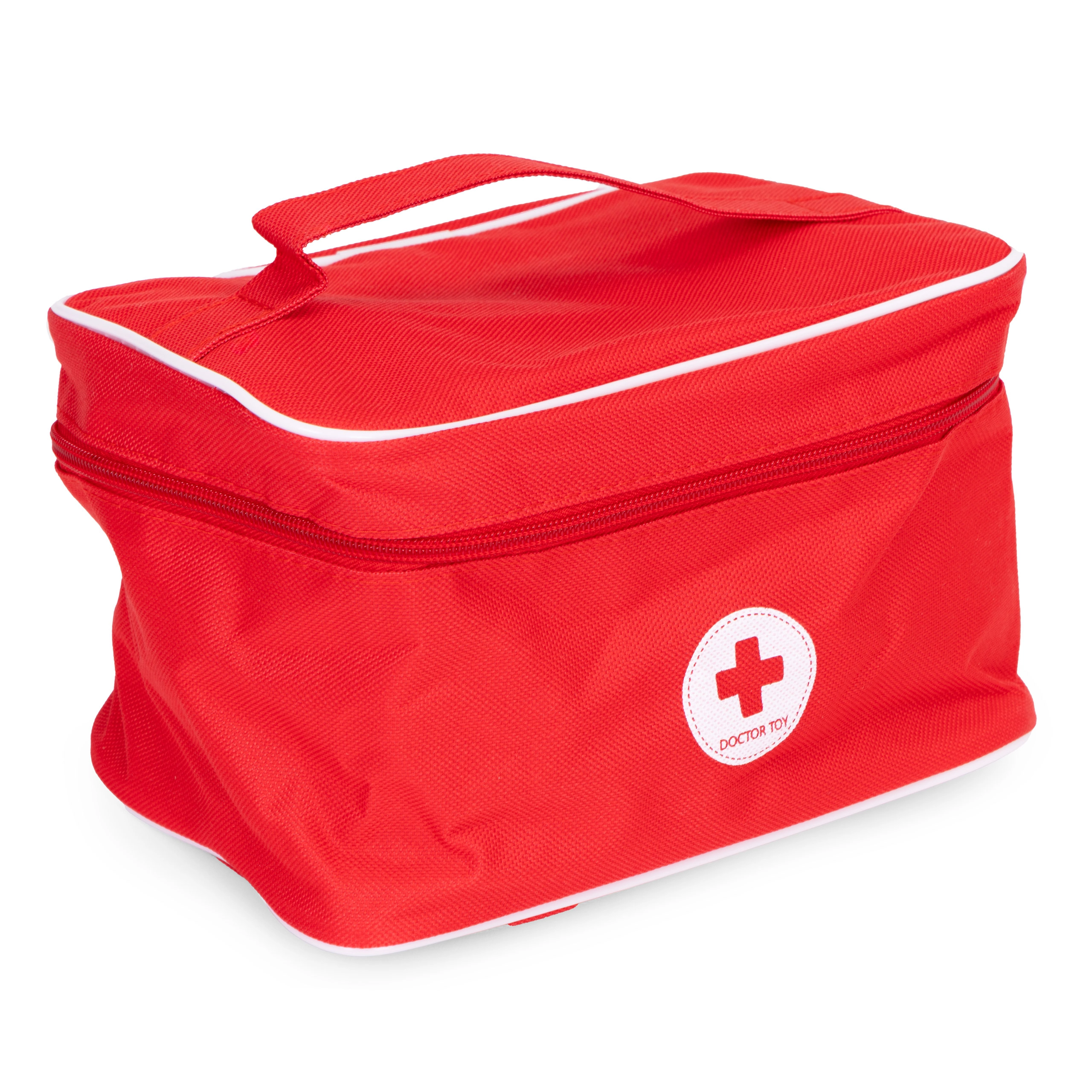 Die weiche Arzttasche mit Reißverschluss und Tragegriff hält alle Zubehörteile beisammen – ideal für unterwegs und den Kindergarten.