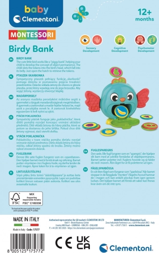 Niedliche Montessori-Spardose Vögelchen CLEMENTONI BABY. Sichere Materialien, leichtes Entleeren, ideal zur Förderung finanzieller Bildung und als Geschenk.