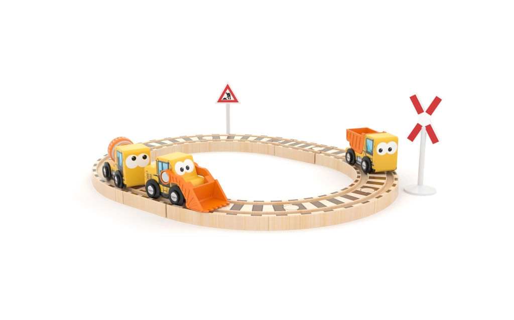 Dieses hochwertige Holzset vereint die Welt der Züge und der Baustelle zu einem Spielerlebnis. Kinder können die Schienen zusammenstecken, Baumaschinen einsetzen und eigene Baustellengeschichten erschaffen. Sichere Materialien und eine glatte Verarbeitung sorgen für ein angenehmes und sicheres Spiel.