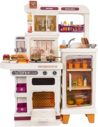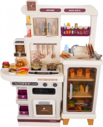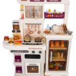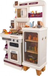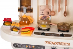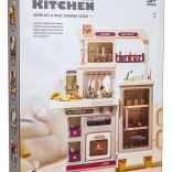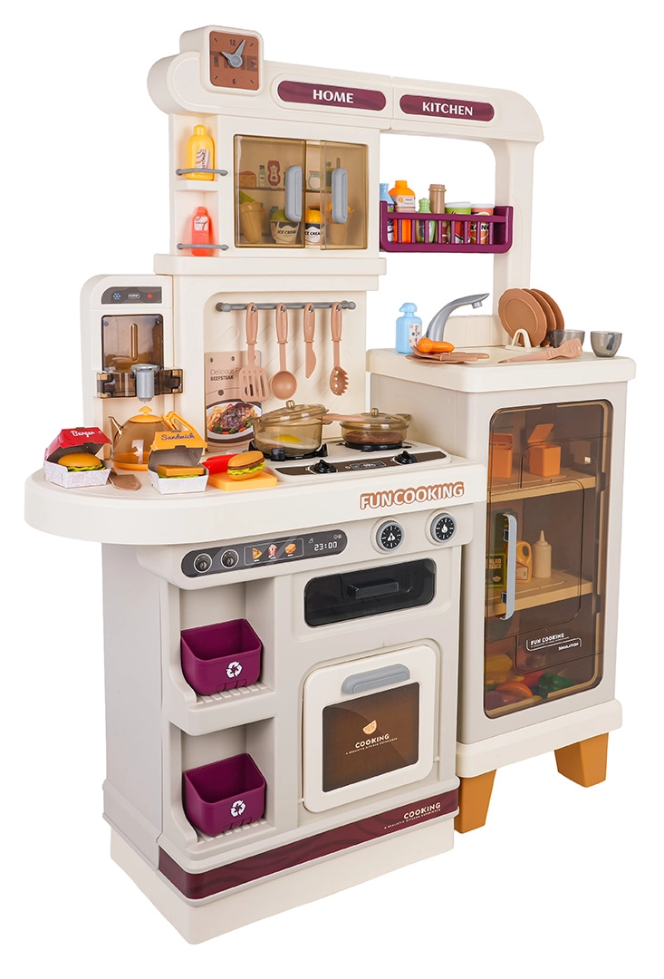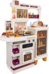 Diese multifunktionale Küche in elegantem Beigeton besteht aus hochwertigem, robustem Kunststoff und begeistert Kinder mit realistischen Funktionen. Die beleuchteten Kochfelder erzeugen Koch- und Bratgeräusche, aus einem Kochfeld steigt feiner Dampf auf und aus dem funktionierenden Wasserhahn fließt Wasser. Der öffnende Backofen und der Kühlschrank sowie Regale und Haken halten sämtliches Zubehör ordentlich an seinem Platz.