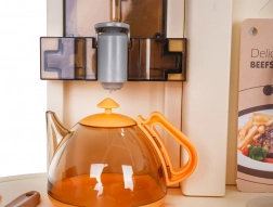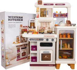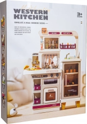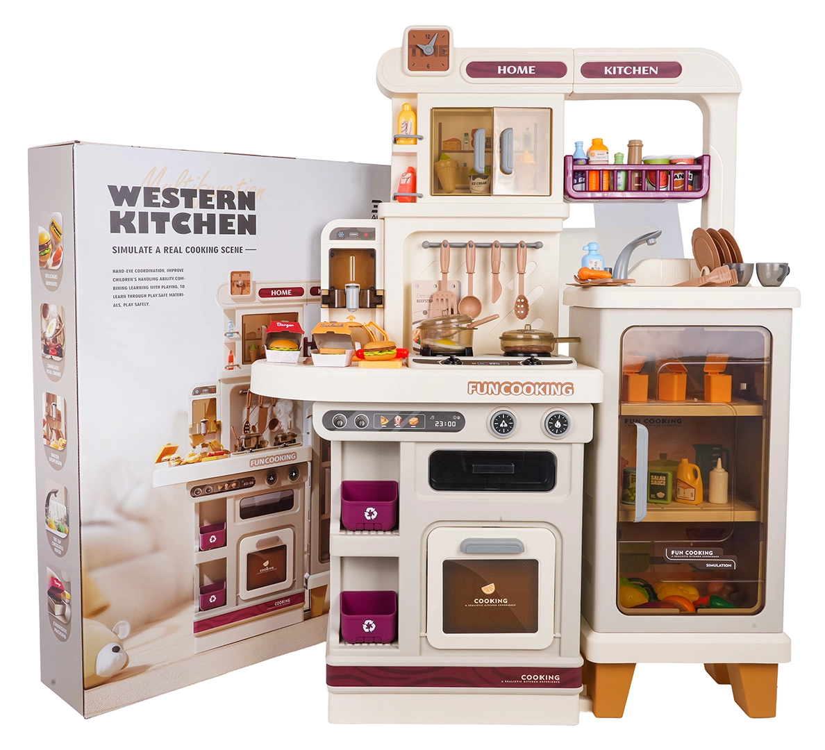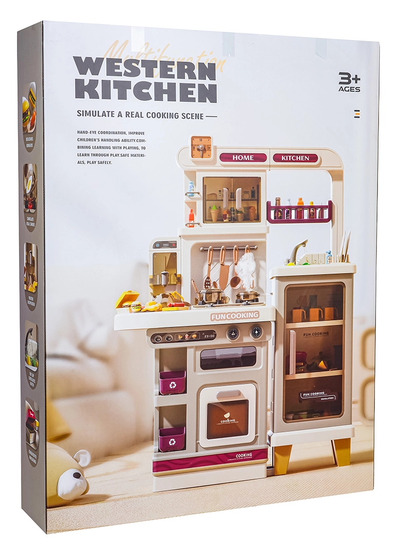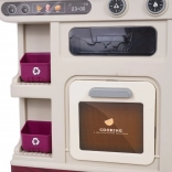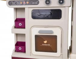 Im Lieferumfang befinden sich 93 Teile – Töpfe, Pfanne, Kanne, Geschirr, Besteck, Küchenutensilien, Gewürzstreuer, Mülleimer sowie eine große Auswahl an Lebensmitteln und Getränken. Uhr mit beweglichen Zeigern und Menü-Kärtchen sorgen für noch mehr Fantasie. Die Küche ist ideal zur Förderung der Feinmotorik, sozialer Kompetenzen und kreativen Spiels.