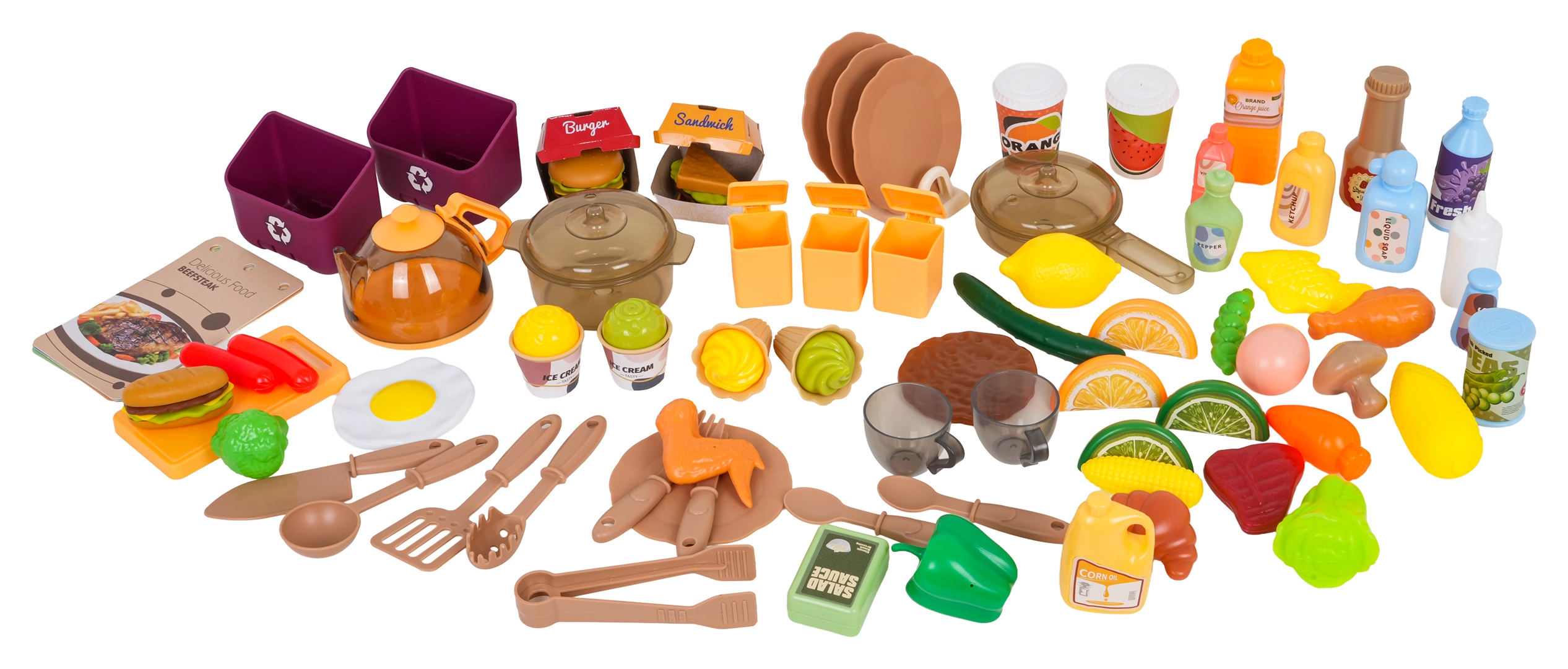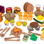 Töpfe, Pfanne, Kanne, Geschirr, Besteck, Gewürzstreuer, Lebensmittel, Menü-Karten und Mülleimer – alles, was kleine Köche brauchen.