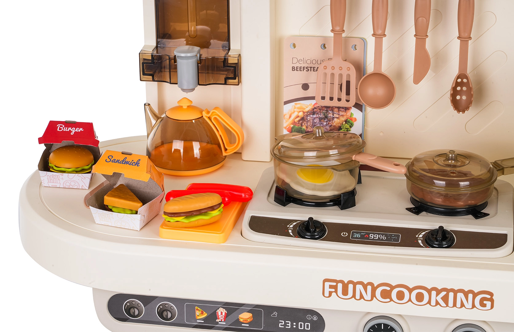 Beleuchtete Kochfelder mit Koch- und Bratgeräuschen werden durch Dampf aus dem Topf ergänzt – Kinder erleben bei jedem Rezept eine authentische Atmosphäre.