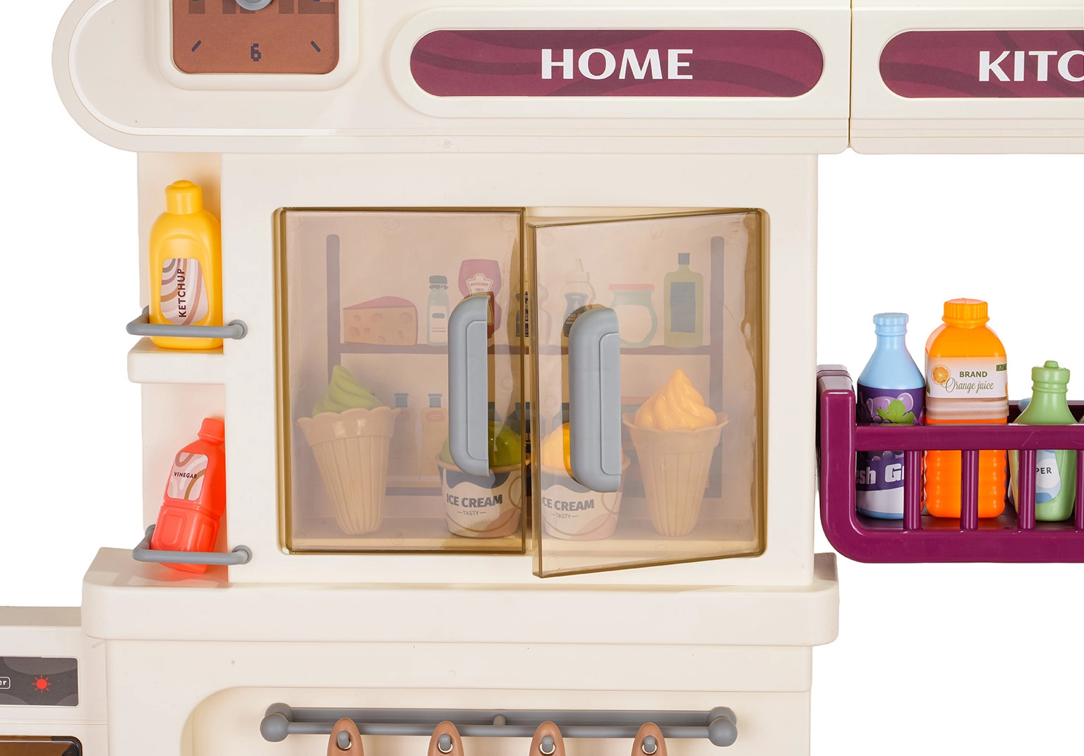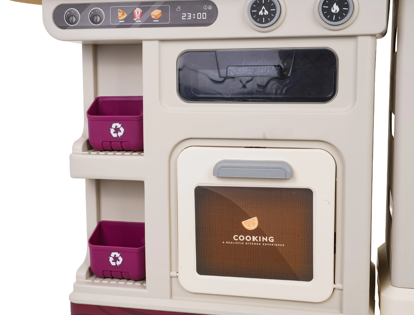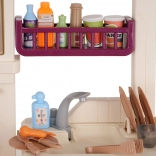 Aus dem Wasserhahn fließt wirklich Wasser, während Kühlschrank, Backofen, Schränke und Regale sämtliches Zubehör aufnehmen und die Spielecke ordentlich halten.