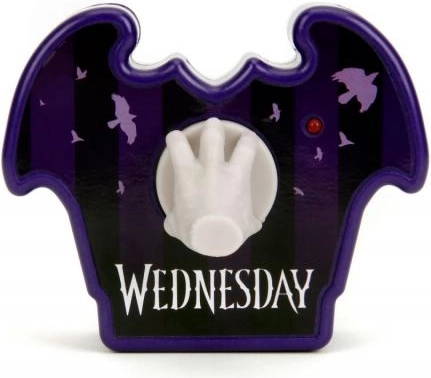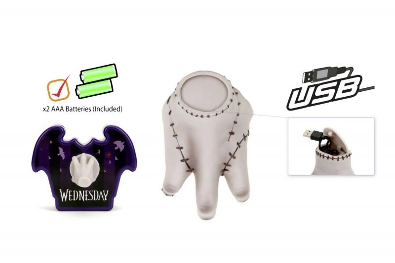 Entdecken Sie die Kultfigur Thing aus der Serie WEDNESDAY als spaßige ferngesteuerte Figur mit 16 cm Höhe von Jada Toys. Inklusive stylischer lila Fledermaus-Fernbedienung mit einer kleinen Hand als Joystick. Einfach Batterien einsetzen, die Oberseite des Spielzeugs drücken und die Hand beginnt sich zu bewegen – ein perfektes Geschenk für Kinder und erwachsene Fans.