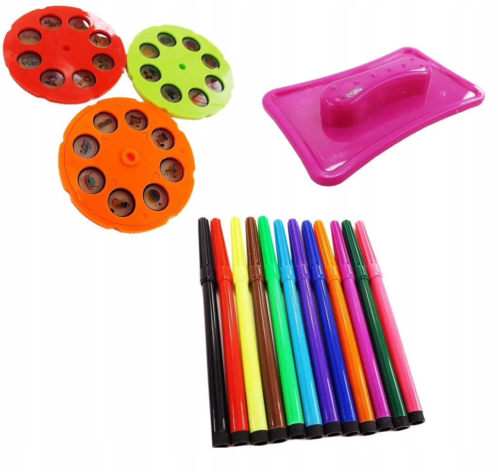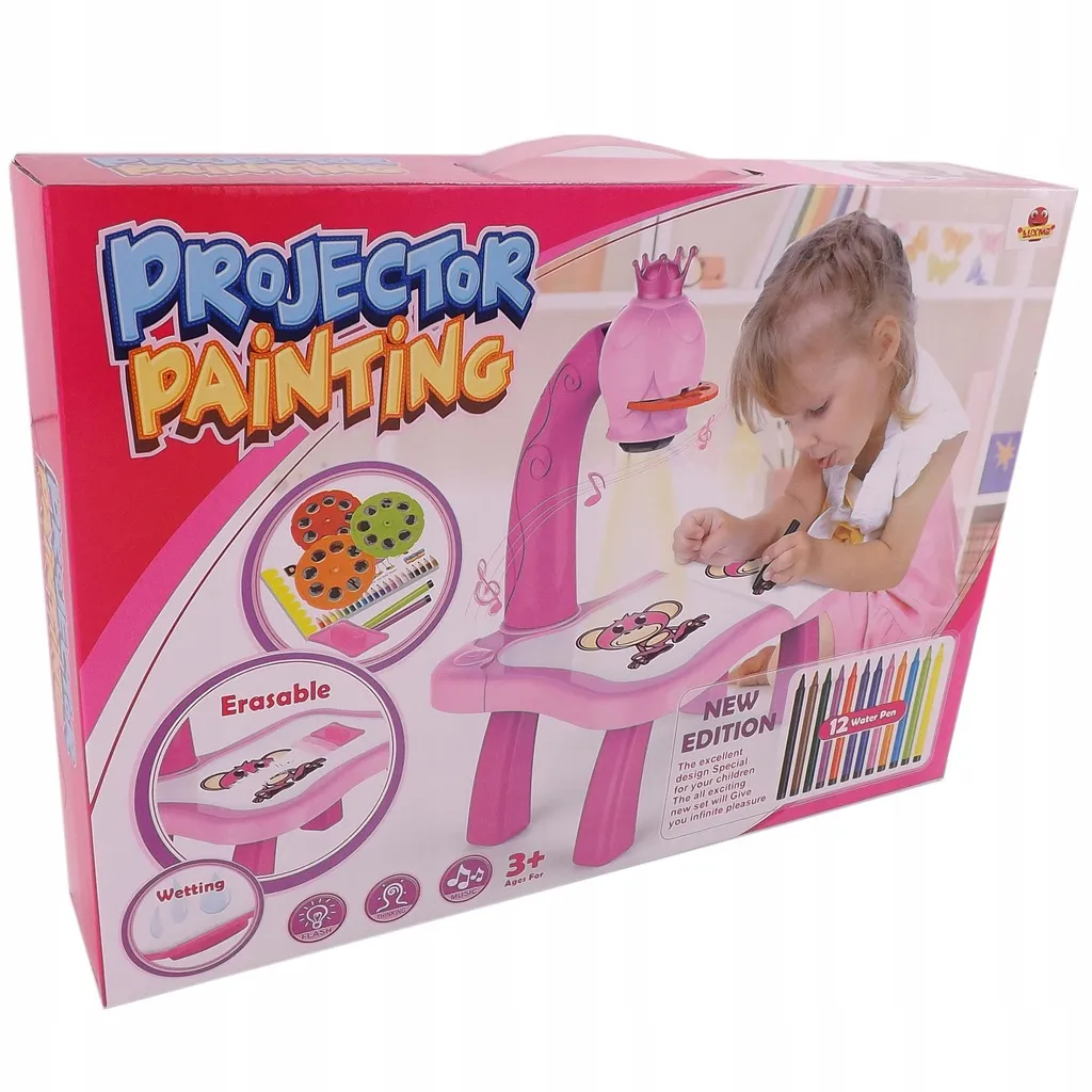 Das Set enthält 3 austauschbare Scheiben (je 8 Motive), thematisch sortiert: Tierchen, Fahrzeuge sowie Obst und Gemüse – zusammen 24 Vorlagen für endlosen Malspaß. Dank 12 integrierter Melodien kann das Kind mit Musik oder in Stille zeichnen, und der Projektor dient zusätzlich als Nachtlicht.