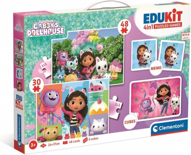 Das Lernset EduKit 4 in 1 Gabis Katzenhaus vereint vier beliebte Aktivitäten in einer Box. Kinder genießen das Zusammensetzen von zwei Puzzles mit 30 und 48 Teilen, das Trainieren des Gedächtnisses mit Memo-Karten und das Bauen mit 6 Bausteinen. Dank der Motive aus der beliebten Serie ist jedes Spiel spaßig, bunt und motivierend.