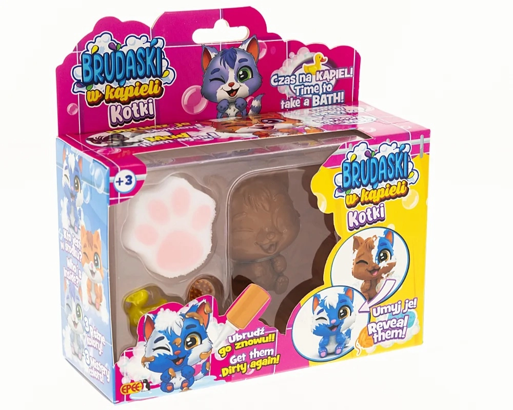 Das Kätzchen Łatek aus der Kollektion „Brudasci in der Badewanne – Kätzchen“ ist das ideale interaktive Spielzeug für Kinder, die Baden und die Pflege von Tieren lieben. Die spezielle Oberfläche ermöglicht es, das Kätzchen mit dem beiliegenden Matsch sicher zu beschmutzen und anschließend mit Wasser und Schwämmchen wieder leicht zu reinigen. Diese wiederholbare Aktivität macht Spaß und vermittelt gleichzeitig die Bedeutung von Sauberkeit.