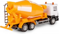 Die orangefarbene Trommel dreht sich frei und imitiert die Arbeit eines echten Betonmischers – ideal für kreatives Bauspiel.