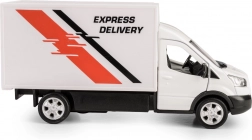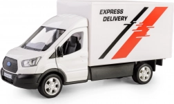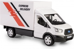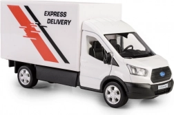 Dieses weiße Modell des Lieferwagens FORD Transit 2018 ist eine präzise gefertigte Replik des echten Fahrzeugs. Die Kombination aus Metall und Kunststoff sorgt für Robustheit und authentisches Aussehen, während die öffnenden Türen den Blick in den detailreich ausgeführten Innenraum ermöglichen. Dank der Gummireifen und der hochwertigen Automobillackierung wirkt das Modell sehr realistisch.