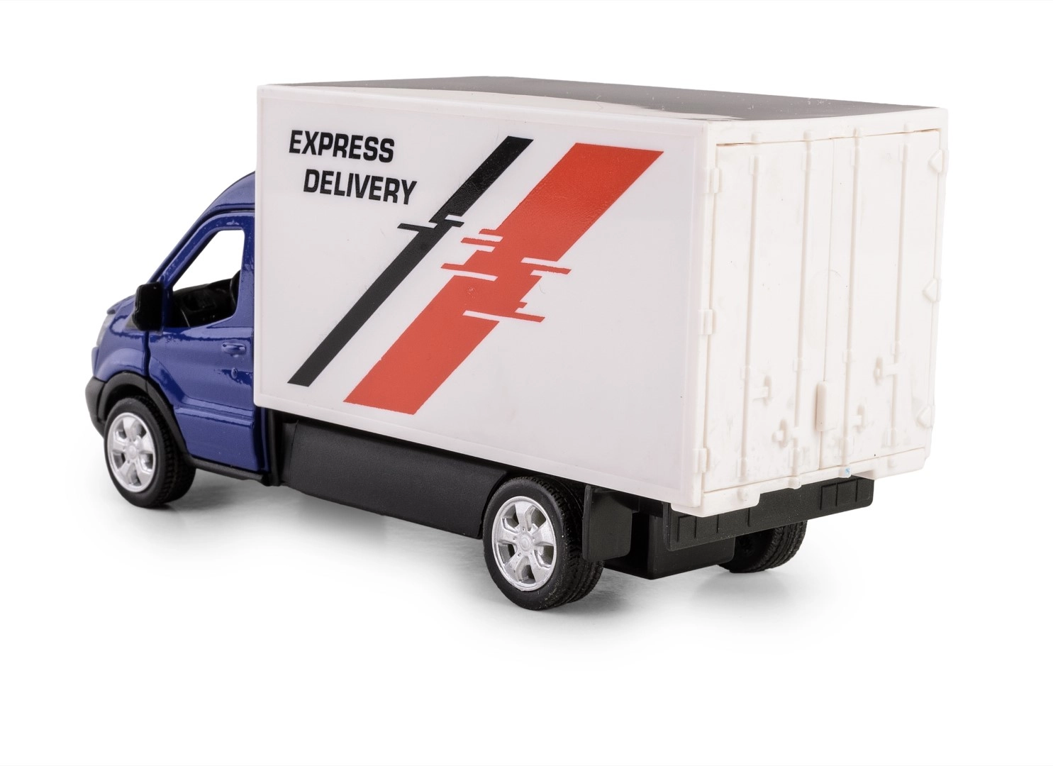Dank der öffnenden Türen lässt sich der Innenraum betrachten, und der Pull-Back-Mechanismus katapultiert das Auto nach dem Aufziehen nach vorn. Der realistische Look wird durch den blauen Lack, silberne Räder und den markanten Express-Delivery-Aufdruck unterstrichen.