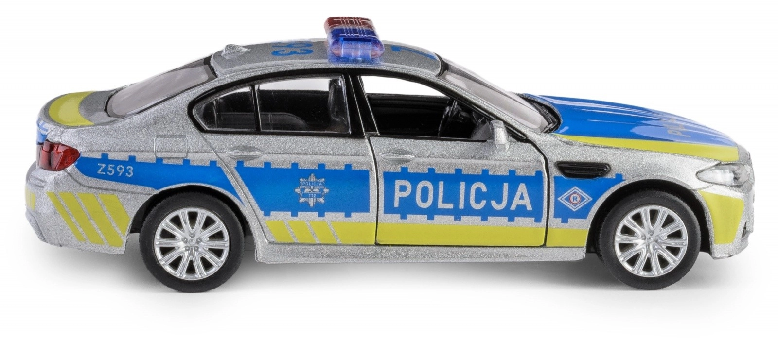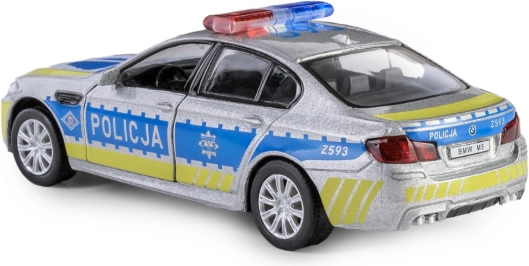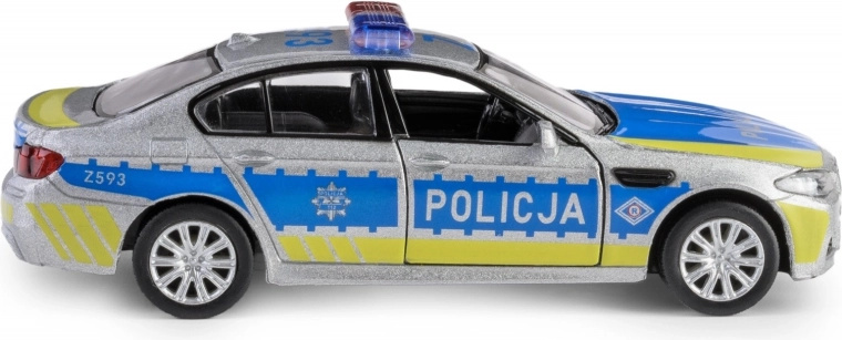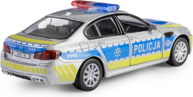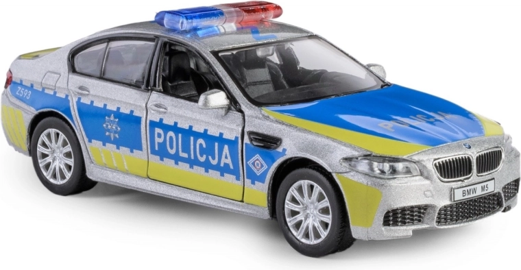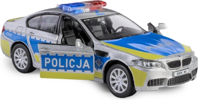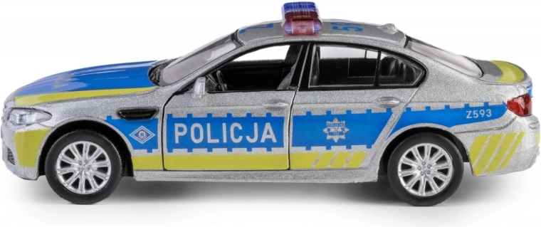 Entdecken Sie die detailgetreue Replik des BMW M5 im Polizeidesign, die durch eine Metallkarosserie, präzise gestalteten Innenraum und funktionale Elemente überzeugt. Das Modell im Maßstab 1:32 ist mit einem praktischen Pull-Back-Antrieb ausgestattet – einfach nach hinten ziehen und das Fahrzeug fährt vorwärts.