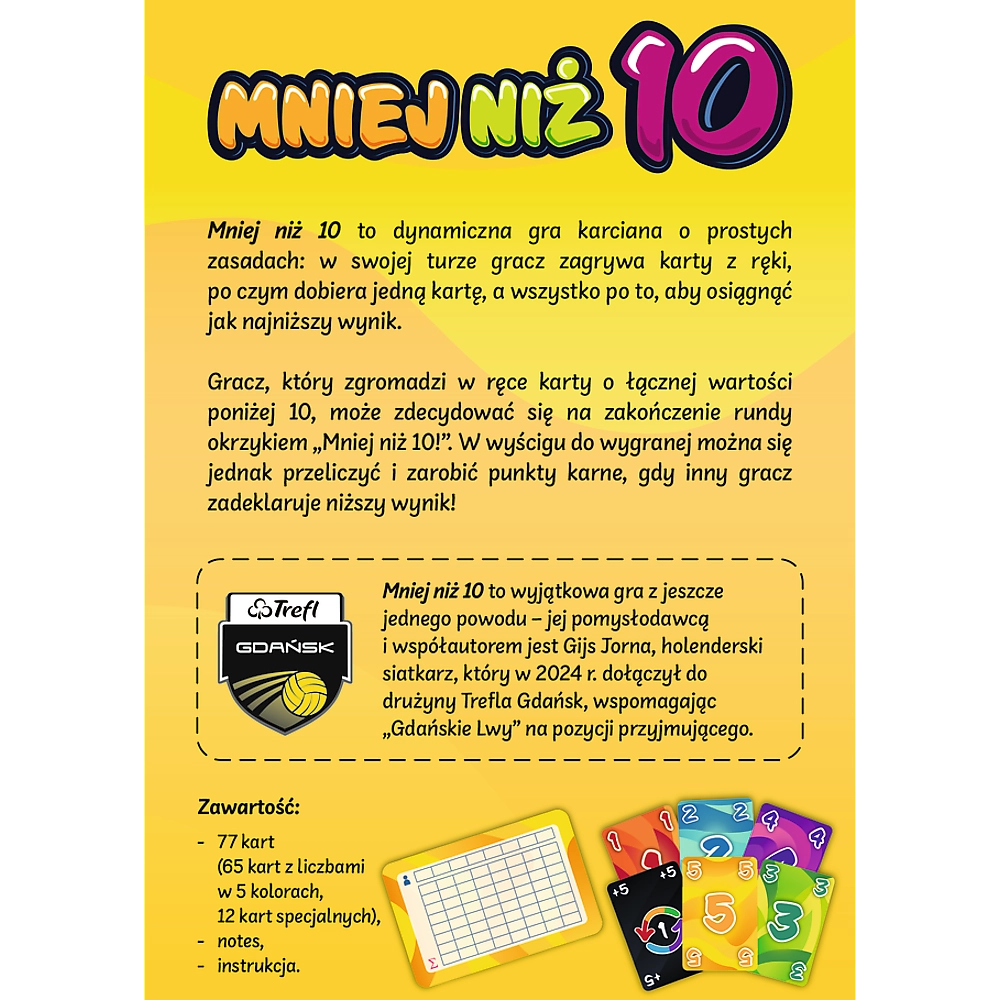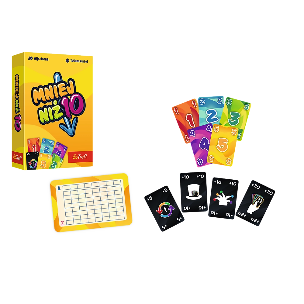 Sucht ihr ein flottes und zugängliches Kartenspiel, das Familie und Freunde gleichermaßen begeistert? Mniej niż 10 kombiniert einfache Regeln mit taktischem Spiel. In jedem Zug entscheidet ihr, ob ihr eine oder mehrere Karten ausspielt und wie ihr geschickt die Punktesumme anpasst, um der Siegschwelle unter zehn näherzukommen.