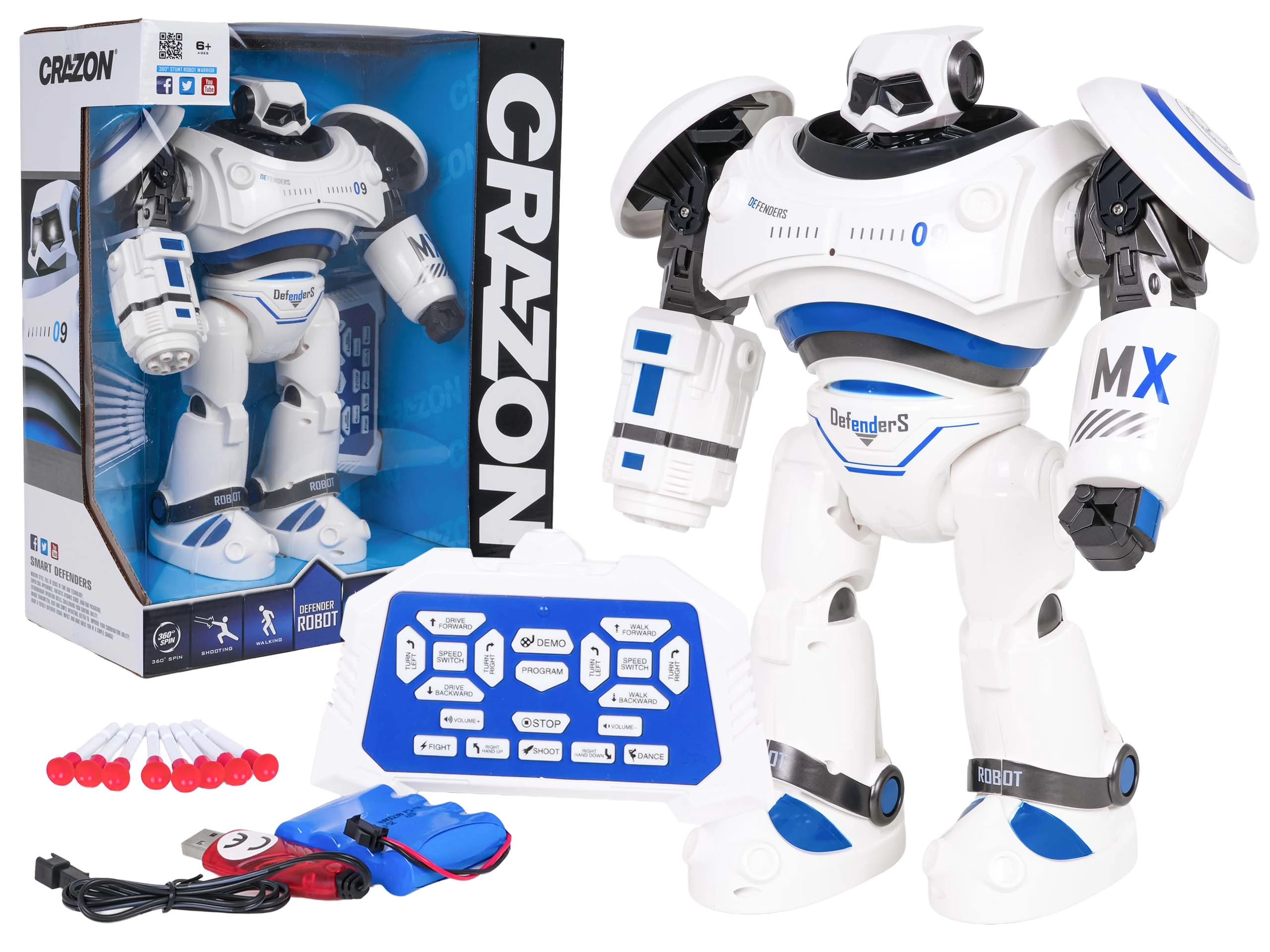 Im Lieferumfang ist ein wiederaufladbarer 4,8 V 700 mAh Ni-Cd-Akku mit USB-Ladung sowie ein Set aus 8 Saugnapf-Pfeilen enthalten. Der Roboter fährt vorwärts und rückwärts, lenkt nach rechts und links, kann gleiten und eine 360°-Drehung ausführen. Das Pfeilschießen hat eine Reichweite von etwa 5 m. Der DEMO-Modus zeigt alle Fähigkeiten auf Knopfdruck und die mehrstufige Lautstärkeregelung sorgt für komfortable Nutzung drinnen und draußen.
